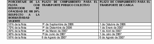 Que por tal motivo dentro del presente acto administrativo se establecen las condiciones de aprobación del Programa de Autorregulación Ambiental, el porcentaje de la flota que debe estar por debajo de los límites permisibles de opacidad y los términos progresivos de cumplimiento diferidos entre el 1 de Septiembre de 2006 y el 06 de Agosto de 2007, según corresponda al Transporte Público Colectivo de Pasajeros o de Carga.