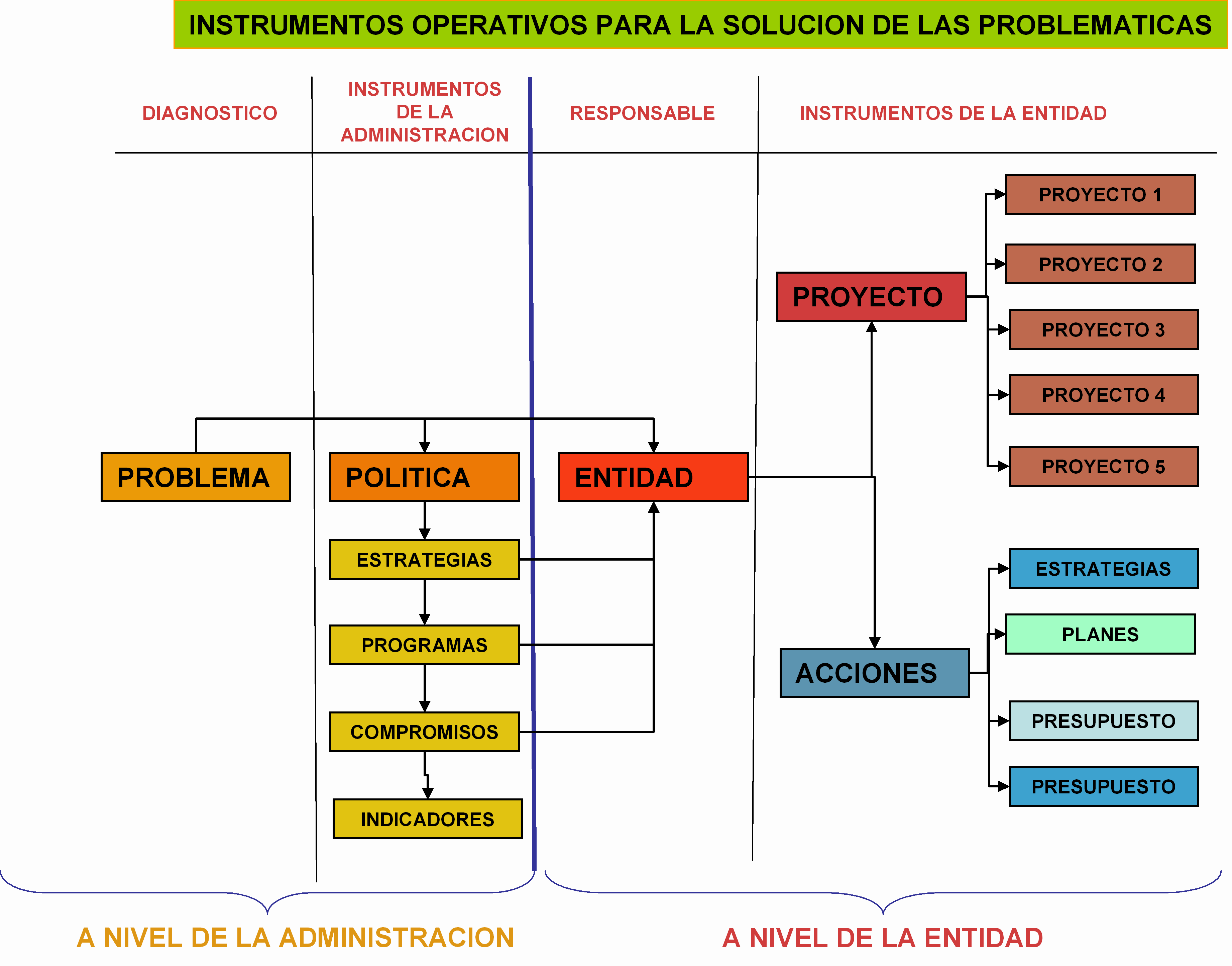 Los instrumentos operativos de solución son aquellos medios de intervención tales como proyectos o acciones que la entidad ha fijado ejecutar para atender cada uno de los problemas que fueron identificados y permiten dar operatividad a una política y que incidirán en la transformación del problema.