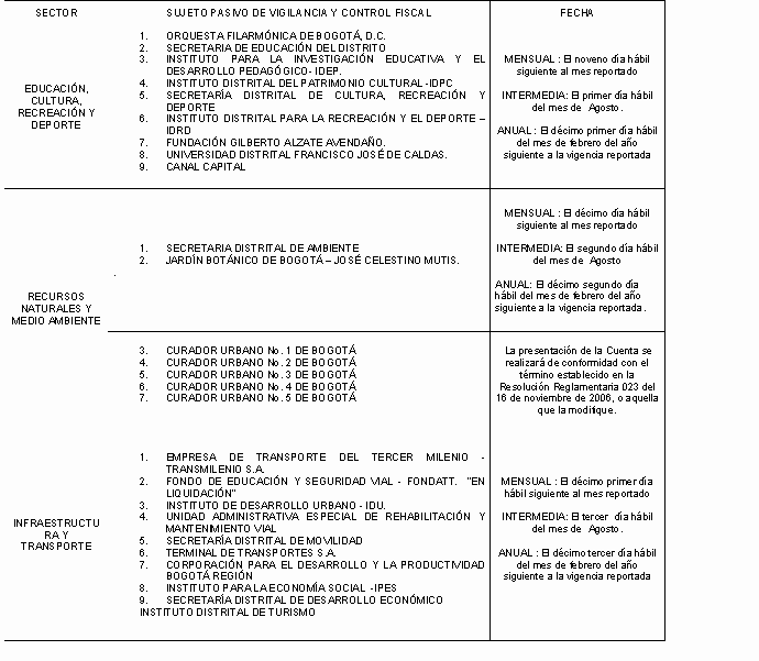 RESOLUCIÓN REGLAMENTARIA 016 DE 2007 (Julio 10) Derogada por el art. 5, Resolución Contraloría Distrital 009 de 2008 "Por la cual se establece el término para la presentación de la cuenta consolidada de los sujetos pasivos de vigilancia y control fiscal a la Contraloría de Bogotá, D.C., y se dictan otras disposiciones". EL CONTRALOR DE BOGOTÁ, D.C. En ejercicio de sus atribuciones constitucionales, legales y reglamentarias, en especial las conferidas en los artículos 267, 268 y 272 de la Constitución Política de Colombia, la Ley 42 de 1993, el Decreto Ley 1421 de 1993 y el Acuerdo 24 de 2001 y CONSIDERANDO Que la Contraloría de Bogotá, D.C., expidió las Resoluciones Reglamentarias No. 020 del 20 de septiembre de 2006 «Por medio de la cual se prescriben los métodos y se establece la forma, términos y procedimientos para la rendición de la cuenta y la presentación de informes, se reglamenta su revisión y se unifica la información que se presenta a la Contraloría de Bogotá D.C.", No. 001 de enero 26 de 2007, "Por la cual se modifica la Resolución Reglamentaria 020 del 20 de septiembre de 2006" y No. 002 del 12 de febrero de 2007 "Por la cual se prorroga el término para la presentación de algunos informes de la Cuenta Consolidada Anual de la vigencia fiscal 2006 y se dictan otras disposiciones".Que el Concejo de Bogotá, D.C., expidió el Acuerdo 257 de noviembre 30 de 2006, "Por el cual se dictan normas básicas sobre la estructura, organización y funcionamiento de los organismos y de las entidades de Bogotá, Distrito Capital, y se expiden otras disposiciones" Que el precitado Acuerdo consagra los criterios y reglas generales para suprimir o fusionar organismos y entidades distritales, así como su creación y transformación. Que la Contraloría de Bogotá, D.C., expidió la Resolución Reglamentaria 009 del 25 de abril de 2007, "Por la cual se agrupan por sectores y se reasignan los sujetos pasivos de vigilancia y control fiscal a las direcciones sectoriales de fiscalización de la Contraloría de Bogotá D.C.", modificada por la Resolución Reglamentaria 014 de 31 de mayo de 2007; para armonizar la estructura del distrito capital y las direcciones sectoriales de fiscalización establecidas en el Acuerdo 24 de 2001. Que se hace necesario establecer el término para la presentación de la cuenta consolidada mensual, intermedia y anual de los sujetos de vigilancia y control fiscal reasignados a las direcciones sectoriales de fiscalización de la Contraloría de Bogotá, D.C. Que la Contraloría de Bogotá, D.C., está unificando el formato de plan de mejoramiento previsto en las Resoluciones Reglamentarias 023 de 2002 y 020 de 2006, por lo cual se hace necesario precisar su contenido y forma de presentación. RESUELVE: Artículo 1º. TÉRMINO PARA LA PRESENTACIÓN DE LA CUENTA CONSOLIDADA. El término máximo para la rendición de la cuenta consolidada mensual, intermedia y anual a la Contraloría de Bogotá, D.C., será el siguiente: A. La rendición electrónica a través del Sistema de Vigilancia y Control Fiscal - SIVICOF, se presentará así: Mensual: El noveno día hábil siguiente al mes reportado. Intermedia: El primer día hábil del mes de Agosto. Anual: El noveno día hábil del mes de Febrero. B. La presentación de los documentos físicos indicados en el Anexo A de la Resolución Reglamentaria 001 de 2007, se realizará de acuerdo con el siguiente calendario: