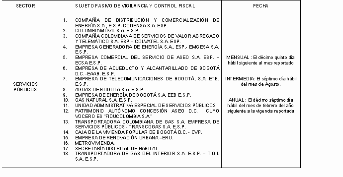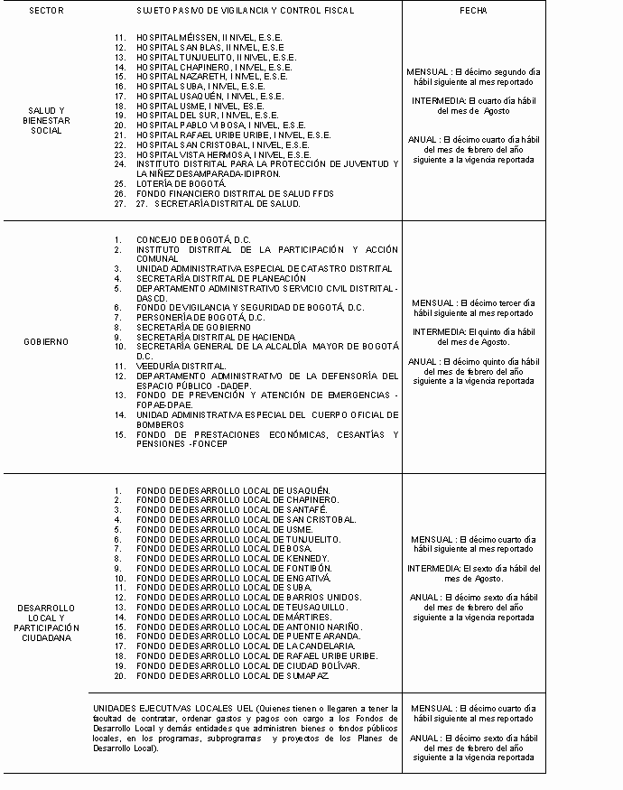 Parágrafo 1. La información intermedia y anual que deben presentar los Fondos de Servicios Educativos, según los Artículos 19 y 20 de la Resolución Reglamentaria 020 de 2006, se hará de acuerdo con el siguiente calendario: a. Los Fondos de Servicios Educativos de las Localidades 1, 2, 3, 4 y 14, el último viernes del mes de julio y el último viernes del mes de febrero del año siguiente a la vigencia reportada respectivamente. b. Los Fondos de Servicios Educativos de las Localidades 5, 6, 7 y 15, el último jueves del mes de julio y el último jueves del mes de febrero del año siguiente a la vigencia reportada respectivamente. c. Los Fondos de Servicios Educativos de las Localidades 8, 10 y 17, el último miércoles del mes de julio y el último miércoles del mes de febrero del año siguiente a la vigencia reportada respectivamente. d. Los Fondos de Servicios Educativos de las Localidades 9, 11, 12, 13 y 20, el último martes del mes de julio y el último martes del mes de febrero del año siguiente a la vigencia reportada respectivamente. e. Los Fondos de Servicios Educativos de las Localidades 16, 18 y 19, el último lunes del mes de julio y el último lunes del mes de febrero del año siguiente a la vigencia reportada respectivamente. Parágrafo 2. El Fondo Financiero Distrital de Salud presentará la información bimestral relacionada con los pagos reconocidos como unidad de pago por capitación subsidiada UPC-S, por el cubrimiento de afiliados en el Régimen Subsidiado en Salud, de que trata el Anexo A de la Resolución Reglamentaria 001 de 2007, el décimo día hábil del mes siguiente al que realizó el pago a las Administradoras de Régimen Subsidiado (ARS). Parágrafo 3. En caso que el sujeto de control no presente la información durante los términos establecidos en la presente resolución, la Contraloría de Bogotá D.C. podrá efectuar la verificación respectiva en la fuente, sin perjuicio de la aplicación del régimen sancionatorio determinado en la Ley 42 de 1993 y la reglamentación que regule este proceso. Parágrafo 4. La información de carácter contable se presentará en los términos aquí establecidos y en forma, parámetros y criterios definidos por la Contaduría General de la Nación. Artículo 3º. AVANCE PLAN DE MEJORAMIENTO. Derogado por el art. 11, Resolución Contraloría Distrital 021 de 2007. Mientras la Contraloría de Bogotá D.C., unifica el formato de Plan de Mejoramiento previsto en las Resoluciones Reglamentarias 023 de 2002 y 020 de 2006, los sujetos de control señalados en el Capítulo I de la Resolución Reglamentaria 020 de 2006, que estén obligados a rendir el formato electrónico CB-0402 Plan de Mejoramiento, lo presentarán en medio impreso y magnético con su respectivo seguimiento, en el formato en el cual se dio conformidad. Artículo 4º DEROGATORIA Y VIGENCIA. La presente resolución rige a partir de la fecha de su publicación, deroga el artículo 14 de la Resolución Reglamentaria No. 020 de 2006, el artículo 3 de la Resolución Reglamentaria 001 de 2007 y las demás disposiciones que le sean contrarias. PUBLÍQUESE, COMUNÍQUESE Y CÚMPLASE. Dada en Bogotá, D.C., a los diez (10) días del mes de julio de dos mil siete (2007). ÓSCAR GONZÁLEZ ARANA Contralor de Bogotá, D.C. NOTA: Publicada en el Registro Distrital 3797 de julio 12 de 2007. |