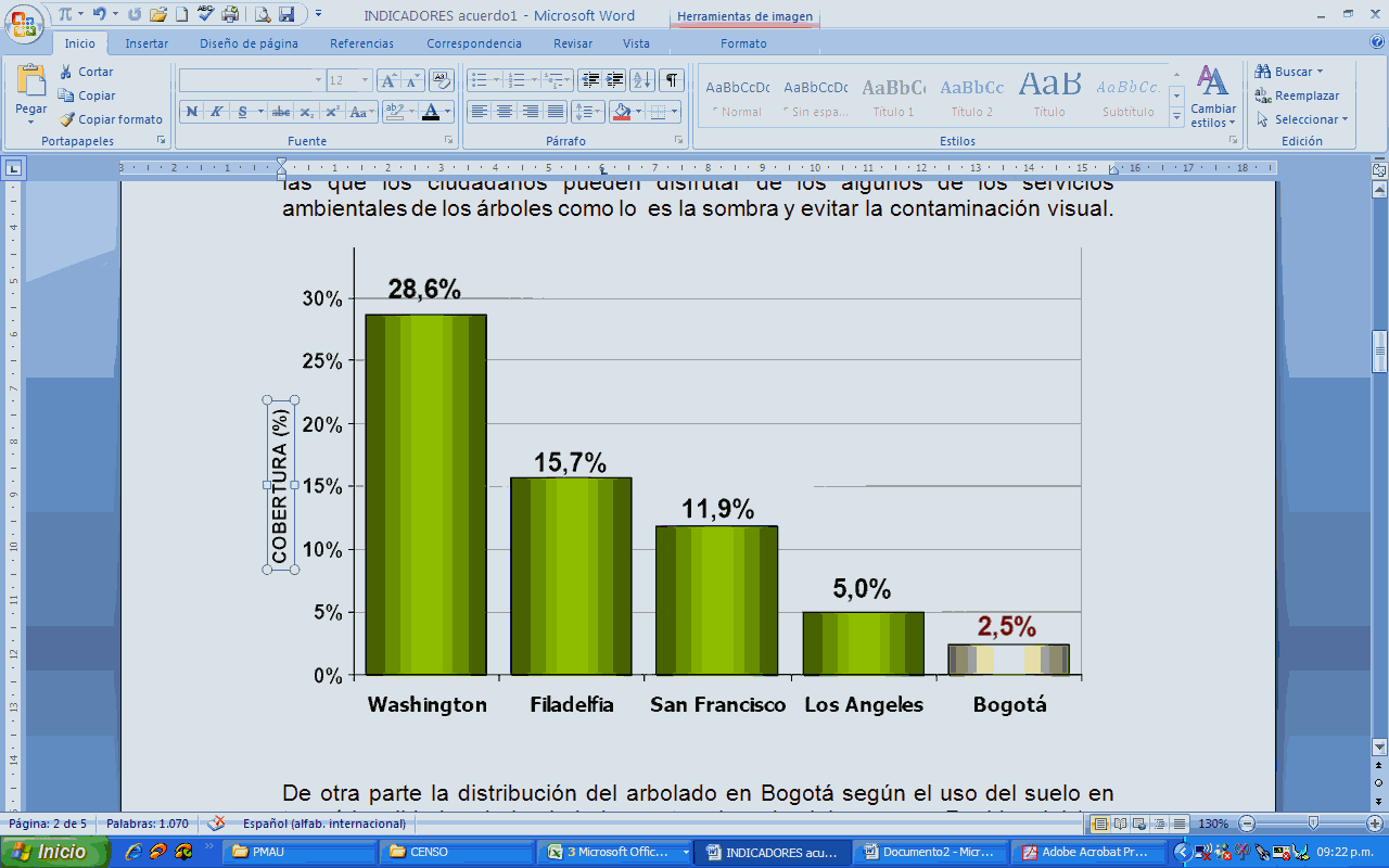Fuente: Censo del Árbol. 2008. Jardín Botánico de Bogotá. Respecto a la cobertura del arbolado en espacio público ésta solo corresponde al 2,5% del perímetro de la ciudad, es decir que en solo se cuenta con 974,5ha en las que los ciudadanos pueden disfrutar de los algunos de los servicios ambientales de los árboles como lo es la sombra y evitar la contaminación visual. Gráfica 1. Cobertura Arbórea Ciudades*