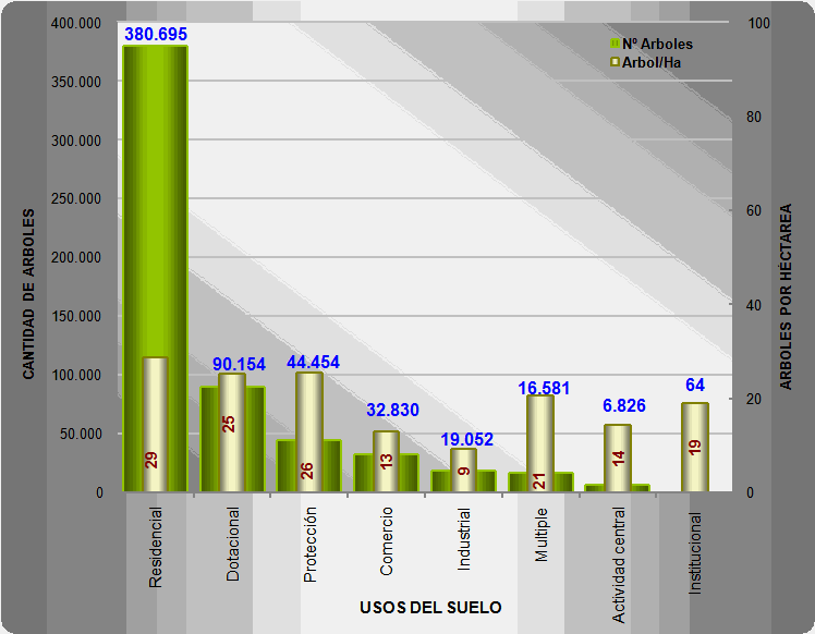 Fuente: USDA ForestService–Nowaket al. (2007). En: Memorias II Encuentro Internacional de Arborización. En la grafica 1, se presenta una comparación del porcentaje de cobertura arbórea de Bogotá y otras ciudades, donde Bogotá es la ciudad con menor cobertura, aunque se debe considerar el hecho que las ciudades de comparación son desarrolladas y con otra visión de planificación, y donde se le ha dado el valor que merece el arbolado urbano como componente de mejoramiento de la calidad de vida. Sin embargo Bogotá debe contemplar en su planificación la valoración que el arbolado urbano representa en una ciudad y la mejora de calidad ambiental que representa para sus habitantes. De otra parte la distribución del arbolado en Bogotá según el uso del suelo en trece1 localidades de la ciudad muestra el predominio en zona Residencial (ver grafica 2), sin embargo es alarmante que de los 590.661 árboles que se presentan en las 13 localidades sólo el 3% (19.052 árboles) se encuentra en zona industrial, lo que hace necesario que se trabaje con los propietarios y gestores ambientales de las fabricas y empresas, para incentivar la plantación y sensibilización respecto a su responsabilidad frente a sus externalidades ambientales. Gráfica 2. Distribución del Arbolado por el Uso del Suelo