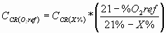 Donde: FC: Flujo del contaminante en kg/h. CCR : Concentración del contaminante a condiciones de referencia (25 °C, 760mm Hg) en mg/m3 . QCR : Caudal del contaminante a condiciones de referencia (25 °C, 760mm Hg) en m3 /h. Artículo 88. Corrección de oxígeno posterior a la medición. Todos los registros y mediciones de los diferentes contaminantes deben realizar la corrección de oxígeno de acuerdo a la siguiente ecuación: