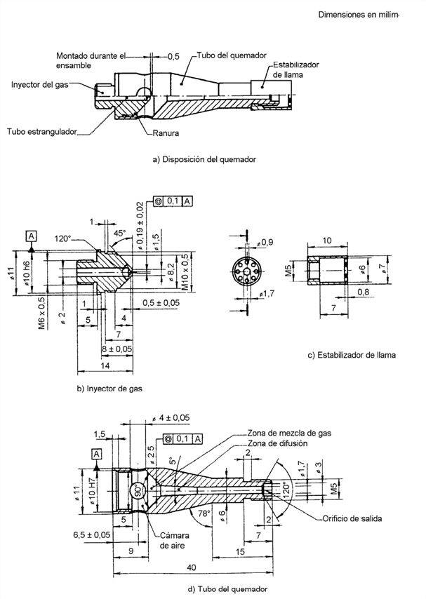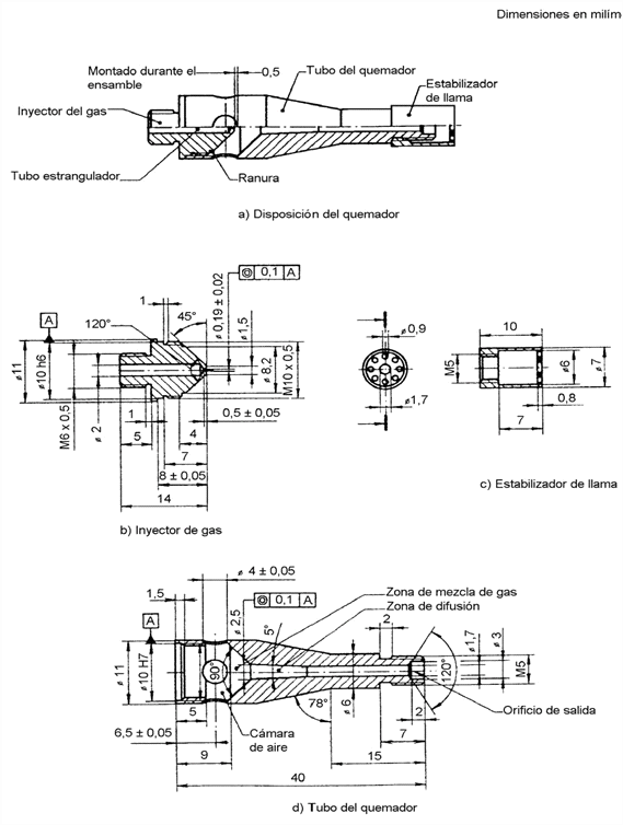 Figura 1. Quemador ANEXO 2 NORMA TECNICA NTC- EN-71-3 SEGURIDAD DE LOS JUGUETES. MIGRACION DE CIERTOS ELEMENTOS 0. INTRODUCCION Esta norma sobre seguridad de juguetes consta de las partes siguientes: Parte 1: Propiedades físicas y mecánicas. Parte 2: Inflamabilidad. 000Parte 3: Migración de ciertos elementos. Parte 4: Juegos de experimentos químicos y actividades relacionadas. Parte 5: Juguetes químicos distintos de los juegos de experimentos. Parte 6: Símbolo gráfico para el etiquetado de advertencia sobre la edad. Esta norma es la Parte 3 de la norma sobre seguridad de los juguetes norma NTC-EN 71. Los requisitos de esta norma se basan en la biodisponibilidad resultante de la utilización de los juguetes, siendo el objetivo recomendado no superar los niveles diarios mencionados a continuación: - 0,2 µg para el antimonio. - 0,1 µg para el arsénico. - 25,0 µg para el bario. - 0,6 µg para el cadmio. - 0,3 µg para el cromo. - 0,7 µg para el plomo. - 0,5 µg para el mercurio. - 5,0 µg para el selenio. Para la interpretación de estos valores ha sido necesario determinar un límite superior para la ingestión de material del juguete. Para fijar este límite superior se ha dispuesto de muy pocos datos. Se eligió como hipótesis de trabajo una ingestión media de 8 mg por día de material del juguete, teniendo en cuenta que en algunos casos particulares este valor podría ser más elevado. Combinando la ingestión diaria de 8 mg con los valores de biodisponibilidad anteriormente indicados, se obtuvieron los límites para los diferentes elementos tóxicos en microgramos por gramo (miligramo por kilogramo) que se detallan en la Tabla 1. Los valores obtenidos se determinaron para minimizar la exposición de los niños a los elementos tóxicos y para garantizar la viabilidad analítica, teniendo en cuenta los límites alcanzables en condiciones normales de fabricación (véase el numeral D.1). 1. OBJETO Y CAMPO DE APLICACION Esta parte de la norma específica los requisitos y los métodos de ensayo para la migración a partir de los materiales de los juguetes y de las partes de los juguetes, con excepción de los materiales no accesibles (véase la Parte 1 de esta norma) de los elementos siguientes: antimonio, arsénico, bario, cadmio, cromo, plomo, mercurio y selenio. No se incluyen los materiales de embalaje, salvo que formen parte del juguete o estén dotados de un valor lúdico (véase el Anexo D). Cuando sea necesario, se someterá al juguete a los ensayos apropiados, especificados en la Parte 1 de esta norma antes de considerar la accesibilidad de las partes. Los requisitos son relativos a la migración a partir de los materiales de los juguetes siguientes: - Recubrimientos de pinturas, barnices, lacas, tintas de impresión, polímeros y recubrimientos similares (véase el numeral 8.1). - Polímeros y sustancias similares, incluidos los laminados, se trate de textiles reforzados o no, con exclusión de otros textiles (véase el numeral 8.2). - Papel y cartón (véase el numeral 8.3). - Textiles, naturales o sintéticos (véase el numeral 8.4). - Cristal, cerámica, materiales metálicos (véase el numeral 8.5). - Otros materiales, coloreados en la masa o no (por ejemplo, madera, cartón duro, tablero duro, hueso y cuero) (véase el numeral 8.6). - Materiales destinados a dejar una marca (por ejemplo, mina de grafito de los lápices y tinta líquida de los bolígrafos) (véase el numeral 8.7). - Materiales para modelar, incluidas las pastas de modelado y geles (véase el numeral 8.8). - Pinturas, incluidas las pinturas para dedos, barnices, lacas, polvos de esmaltar y sustancias similares, en forma sólida o líquida, presentes como tales en el juguete (véase el numeral 8.9). Los juguetes y las partes de juguetes que, por el hecho de su accesibilidad, función, peso, tamaño u otras características excluyan manifiestamente cualquier riesgo debido a la succión, el lamido o la ingestión, habida cuenta del comportamiento habitual y previsible de los niños, no están cubiertos por esta parte de la NTC-EN 71. Nota. Para los fines de esta norma, los criterios siguientes son los apropiados para clasificar la succión, lamido o ingestión: - Todos los juguetes destinados a entrar en contacto con la comida o la vía oral, incluyéndose en categoría de los juguetes los cosméticos de juguete y los instrumentos para escribir. - Los juguetes destinados a los niños menores de seis años, es decir, todos los componentes y partes accesibles para los que exista una probabilidad de que dichos componentes o partes entren en contacto con la boca (véase el Anexo D). 2. NORMAS PARA CONSULTA Esta norma incorpora disposiciones de otras publicaciones por su referencia, con o sin fecha. Estas referencias normativas se citan en los lugares apropiados del texto de la norma y se relacionan a continuación. Las revisiones o modificaciones de cualquiera de las publicaciones referenciadas con fecha sólo se aplican a esta norma cuando se incorporan mediante revisión o modificación. Para las referencias sin fecha, se aplica la última edición de esa publicación. NTC EN 71-1, Juguetes. Seguridad de los juguetes. Propiedades mecánicas y físicas. ISO 3696, Agua para laboratorio para usos analíticos. Especificación y métodos de ensayo. 3. DEFINICIONES Para los fines de esta norma, se aplican las definiciones siguientes: 3.1. Material base: material sobre el cual se pueden formar o depositar los recubrimientos. 3.2. Recubrimiento: todas las capas de material formadas o depositadas sobre el material base o el juguete, incluidas las pinturas, barnices, lacas, tintas, polímeros o cualquier otra sustancia similar, contengan o no partículas metálicas, independientemente de la forma en que se hayan aplicado sobre el juguete y que se puedan retirar raspándolas con una cuchilla. 3.3. Límite de detección de un método: tres veces la desviación estándar del valor del blanco. 3.4. Otros materiales,