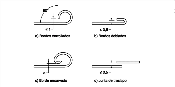 Figura 7. Ejemplos de figuras para juegos El requisito se aplica a figuras con elementos adicionados o moldeados, tales como sombreros o pelo, que conservan la forma redondeada del extremo. 4.5.5. Chupos de entretención La longitud de los chupos de entretención fijados a juguetes destinados para niños menores de 36 meses de edad o que se venden juntos tales juguetes no debe ser mayor que 16 mm. Esta medida se toma desde el lado del chupo que va contra el protector hasta el extremo del chupo. Nota. Los chupos de entretención reales fijados a juguetes destinados para niños menores de 36 meses de edad o que se venden junto con tales juguetes deben cumplir los reglamentos nacionales para chupos de entretención reales. 4.5.6. Globos (véase también numerales 4.10c y 4.25d y literal e) numeral 10) Los globos de látex deben llevar una advertencia (véase el literal c) numeral 2.4 para guía). 4.5.7. Canicas El empaque de las canicas y juguetes que contienen canicas removibles o canicas libres después del ensayo de 5.24 debe llevar una advertencia (véase literal c) numeral 2.5b para guía). 4.6. BORDES (véase literal e) numeral 11) 4.6.1. Bordes afilados accesibles de metal o vidrio a) Los juguetes destinados para niños menores de 96 meses de edad no deben tener bordes afilados peligrosos accesibles de vidrio o metal cuando se ensayan conforme a lo especificado en el numeral 5.8 (ensayo de bordes afilados). Si un borde accesible falla en el ensayo de bordes afilados tal como se especifica en el numeral 5.8 se debe evaluar el borde para determinar si presenta un riesgo no razonable de lesión tomando en cuenta el uso previsible y el rango de edad previsto para el juguete; b) Los bordes de metal o vidrio potencialmente afilados se deben considerar no accesibles si quedan adyacentes a una superficie de la muestra de ensayo y ningún espacio vacío entre el borde y la superficie adyacente excede los 0,5 mm (por ejemplo en las juntas traslapadas y bordes confinados Véase la figura 6); c) Los bordes de piezas destinadas para servir como conductores eléctricos y los portaobjetos de microscopios y cubiertas deslizantes se consideran bordes funcionales y no requieren advertencia. 4.6.2. Bordes afilados funcionales a) Los juguetes destinados para niños menores de 36 meses de edad no deben tener bordes afilados funcionales, peligrosos, accesibles; b) Los juguetes destinados para niños de 36 meses a 96 meses de edad que en razón de su función incluyan necesariamente un borde afilado peligroso y no incluyan bordes afilados no funcionales están exentos de los requisitos del numeral 4.6 (por ejemplo, las tijeras funcionales de juguete y los juegos de herramientas de juguete funcionales) siempre y cuando el empaque lleve una advertencia (véase literal c) numeral 2.12 para guía). 4.6.3. Bordes en juguetes metálicos Los bordes metálicos accesibles, incluidos orificios y ranuras, en juguetes destinados para niños menores de 96 meses de edad deben estar libres de asperezas peligrosas y biselados, o deben estar confinados, enrollados o curvados (véase la Figura 1) o deben incorporar un dispositivo o acabado protector permanente. Independientemente de la manera en que se terminen los bordes, se deben someter al ensayo de bordes afilados como se indica en el numeral 5.8. 4.6.4. Bordes en los juguetes moldeados Los bordes accesibles, esquinas o áreas de separación de juguetes moldeados destinados para niños menores de 96 meses de edad deben estar libres de bordes afilados peligrosos producidos por asperezas y rebabas o deben estar protegidos de manera que los bordes peligrosos no sean accesibles. 4.6.5. Bordes en tornillos expuestos o varillas roscadas Los extremos accesibles de tornillos o varillas roscadas deben estar libres de bordes afilados y asperezas, o sus extremos deben estar cubiertos por tapas protectoras de manera que no queden accesibles. Toda tapa protectora que se utilice debe someterse al ensayo de compresión indicado en el numeral 5.24.6 (ensayo de compresión), independientemente de si la tapa es accesible o no al contacto con superficies planas durante los ensayos apropiados indicados en el numeral 5.24 (ensayos de abuso razonablemente previsible). Las tapas protectoras también se deben someter al ensayo especificado en el numeral 5.24.5 (ensayo de torsión) seguido por el ensayo del numeral 5.24.6.1 (ensayo de tensión - generalidades). 4.7. PUNTAS (véase literal e) numeral 12) 4.7.1. Puntas agudas accesibles a) Los puntos accesibles de juguetes destinados para niños menores de 96 meses de edad no deben tener puntas agudas peligrosas accesibles cuando se ensayan conforme con lo especificado en el numeral 5.9 (ensayo de puntas agudas). Si una punta accesible falla en el ensayo de puntas agudas indicado en el numeral 5.9, se debe evaluar para determinar si presenta un riesgo razonable de lesiones tomando en cuenta el uso previsible y el grado de edad para el cual está destinado el juguete. Puntas de lápices e implementos similares de dibujo no son considerados como puntas afiladas. b) Las puntas potencialmente agudas se deben considerar no accesibles si quedan al lado de una superficie de la muestra de ensayo y hay un espacio libre entre la punta y la superficie no mayor de 0,50 mm. c) Las puntas de los juguetes para niños menores de 36 meses de edad cuya dimensión de sección transversal más grande sea de 2 mm o menos y que no presenten necesariamente una punta aguda cuando se ensayan de acuerdo con lo indicado en el numeral 5.9 (ensayo de puntas agudas), se consideran puntas potencialmente peligrosas. Por lo tanto, se deben evaluar para determinar si presentan un riesgo no razonable de lesiones tomando en cuenta el uso previsible y el grado de edad para el cual está destinado el juguete. 4.7.2. Puntas agudas funcionales a) Los juguetes destinados para niños menores de 36 meses de edad no deben tener puntas agudas funcionales peligrosas accesibles; b) Los juguet