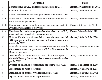 NOTA: El numeral 4º Proceso de Selección y Suscripción del contrato ABD, fue Modificado por el art. 4, Resolución CRC 2594 de 2010 Con excepción de los numerales 3.1.a, 3.1.c y 3.3, todas las actividades y plazos detallados dentro de los mismos serán responsabilidad de los Proveedores. Cualquier incumplimiento por parte de estos será informado por la CRC a las entidades de control y vigilancia para la imposición de las sanciones correspondientes. Parágrafo. Lo anterior, sin perjuicio de las obligaciones establecidas en el artículo 40 del Decreto 25 de 2002, para los proveedores de telecomunicaciones personales universales (UPT) y de servicios. T Í T U L O IX RÉGIMEN SANCIONATORIO Artículo 42. Sanciones. Las infracciones, incumplimientos, o violación a las disposiciones legales, reglamentarias o regulatorias en esta materia serán sancionadas de acuerdo con lo previsto en el Título IX de la Ley 1341 de 2009. Lo anterior, sin perjuicio de las sanciones que por infracción a las normas de promoción de la competencia y protección al usuario corresponda imponer a la Superintendencia de Industria y Comercio, o que por infracción a lo previsto en el numeral 19 del artículo 22 de la Ley 1341 de 2009 corresponda imponer a la CRC. La Comisión realizará el seguimiento al desarrollo de las actividades asociadas a la portabilidad numérica, y de ser pertinente informará sobre eventuales infracciones, incumplimientos, o violaciones a las disposiciones legales, reglamentarias o regulatorias de las que tenga conocimiento. T Í T U L O X DISPOSICIONES TRANSITORIAS Y FINALES Artículo 43. Deber de divulgación. Durante los primeros seis (6) meses contados a partir de la Fecha de Implementación de la Portabilidad Numérica, de conformidad con las fechas establecidas en el artículo 41 de la presente resolución, los Proveedores de Redes y Servicios de Telecomunicaciones de que trata el artículo 2° deberán divulgar de forma amplia en medios masivos de comunicación, tales como televisión, radio, y diarios de circulación nacional, la posibilidad del Usuario de portar su número. Igualmente, deberán divulgar en sus páginas web, de manera permanente, la facilidad de portar el número. Artículo 44. Modificación artículo 2° de la Resolución CRT 1596 de 2006. Agréguese el siguiente numeral al artículo 2º de la Resolución CRT 1596 de 2006: "2. En la expedición de las resoluciones mediante las cuales se determinen condiciones de la implementación y operación de la portabilidad numérica, en ejercicio de las facultades otorgadas a la Comisión en la Ley 1245 de 2008 y en desarrollo de lo previsto en la Resolución CRC "Por la cual se establecen las condiciones para la implementación y operación de la Portabilidad Numérica para telefonía móvil en Colombia". Artículo 45. Números de servicios portados. En un lapso de diez (10) días hábiles contados a partir de la entrada en vigencia de la presente resolución, los Proveedores de Redes y Servicios asignatarios de Numeración No Geográfica de Servicios deberán reportar a la CRC la cantidad de números portados en aplicación de lo dispuesto en el artículo 40 del Decreto 25 de 2002, discriminada por NDC y por Proveedor Receptor, con corte a diciembre 31 de 2009. Artículo 46. Delegación. Delegar en el Director Ejecutivo de la CRC, previa aprobación del Comité de Comisionados de la Comisión, la expedición de los actos administrativos en relación con la modificación de los plazos establecidos en la presente resolución respecto del cronograma para la implementación de la Portabilidad Numérica. Lo anterior, con excepción de la fecha de implementación de la portabilidad numérica en los términos del numeral 7 del artículo 41 de la presente resolución. Artículo 47. Vigencia. La presente resolución rige a partir de la fecha de su publicación en el Diario Oficial, modifica en lo pertinente el artículo 2º de la Resolución CRT 1596 de 2006 y deroga las disposiciones que le sean contrarias. Publíquese y cúmplase. Dada en Bogotá, D. C., a 29 de enero de 2010. La Presidenta, María del Rosario Guerra de la Espriella. El Director Ejecutivo, Cristhian Lizcano Ortiz. (C.F.) NOTA: Publicada en el Diario Oficial 47.618 de febrero 9 de 2010. |