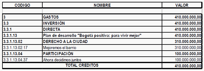 ARTÌCULO SEGUNDO.- Efectúese un Crédito en el Presupuesto de Gastos e Inversión del Fondo de Desarrollo Local Mártires en la Vigencia Fiscal 2010, según el siguiente detalle:
