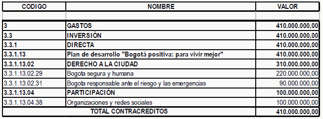 Que la programación inicial del rubro del Proyecto 0174 en la vigencia 2010, es por $40.000.000.oo y el proyecto fue formulado en los siguientes componentes: i) Fortalecimiento y capacitación a los organismos de socorro, comunidad y equipos comunitarios, por valor de $40.000.000.oo Los recursos programados bajo el concepto de Procesos en curso fueron contratados en la vigencia 2009. Estos recursos permitieron dotar a los distintos organismos de socorro con presencia en el Comité Local de Emergencias, dando cumplimiento así al componente de Dotación previsto en la Meta Plan.