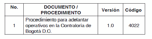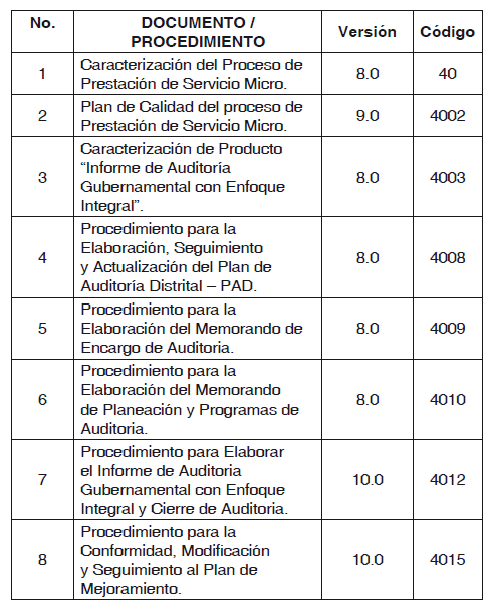 RESOLUCIÓN REGLAMENTARIA 033 DE 2011 (Diciembre 9) Por la cual se adopta la nueva versión de Documentos y Procedimientos relacionados con el Proceso de Prestación de Servicio Micro de la Contraloría de Bogotá y se dictan otras Disposiciones. EL CONTRALOR DE BOGOTA D.C. En ejercicio de sus atribuciones legales y en especial las que le confiere el artículo 6 del Acuerdo 361 de 2009 y CONSIDERANDO: Que de conformidad con los literales j) y l) del artículo 4 de la Ley 87 de 1993 “Por la cual se establecen normas para el ejercicio de control interno en las entidades y organismos del Estado y se dictan otras disposiciones”, se deben implementar como elementos del sistema de control interno institucional procedimientos para la ejecución de procesos y simplificación y actualización de normas y procedimientos. Que el Modelo Estándar de Control Interno MECI, adoptado en la Contraloría de Bogotá mediante Resolución Reglamentaria No. 013 de junio 12 de 2006, contiene entre otros elementos de control del subsistema de control de gestión, los procedimientos conformados por el conjunto de especificaciones, relaciones y ordenamiento de tareas requeridas para cumplir con las actividades de un proceso controlando acciones que requiere la operación de la Contraloría de Bogotá y el manual de procedimientos como una guía de uso individual y colectivo que permite el conocimiento de la forma como se ejecuta o desarrolla su función administrativa, propiciando la realización del trabajo bajo un lenguaje común a todos los servidores públicos. Que mediante el Acuerdo 361 del 6 de enero de 2009: “Por el cual se organiza la Contraloría de Bogotá, D. C., se determinan las funciones por dependencias, se fijan los principios generales inherentes a su organización y funcionamiento y se dictan otras disposiciones”, en su Artículo 6 establece: “En ejercicio de su autonomía administrativa le corresponde a la Contraloría de Bogotá, D.C., definir todos los aspectos relacionados con el cumplimiento de sus funciones en armonía con los principios consagrados en la Constitución, las leyes y en este Acuerdo”. Que el Numeral 9 del artículo 37 Ibidem consagra como una de las funciones de la Dirección de Planeación, “Realizar la revisión técnica de los planes, documentos y procedimientos que adopte la entidad, para asegurar la armonización, implementación y evaluación de los mismos”. Que mediante Resolución Reglamentaria No. 007 de Marzo 31 de 2011, se adoptó la nueva versión de documentos y procedimientos relacionados con el Proceso de Prestación de Servicio Micro de la Contraloría de Bogotá y se dictan otras disposiciones. Que mediante Resolución Reglamentaria No. 018 de Julio 5 de 2011, se determinaron y adoptaron Actuaciones Especiales en la Contraloría de Bogotá D.C. Que la dinámica de la gestión administrativa de las entidades distritales sugiere la implementación de métodos de auditoria en tiempo real, que optimicen la eficacia del control a partir de hechos e indicios relevantes que adviertan gestiones en detrimento del patrimonio público; por lo tanto, el día 9 de Noviembre de 2011 la Alta Dirección consideró necesario como oportunidad de mejora frente al Sistema de Gestión de la Calidad SGC implementado en la entidad, incorporar lo establecido en la Resolución Reglamentaria 018 de 2011 en el SGC, realizando los ajustes que permitan un mejor desarrollo de este tipo de actuaciones del control fiscal. En merito de lo expuesto, RESUELVE: ARTÍCULO PRIMERO.- Adoptar la nueva versión de los siguientes documentos y Procedimientos del Proceso de Prestación de Servicio Micro: Los numerales 1, 2, 3, 4, 5, 7 y 8 del presente artículo, fueron derogados por el art. 6, Resolución Contraloría Distrital 030 de 2012