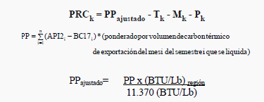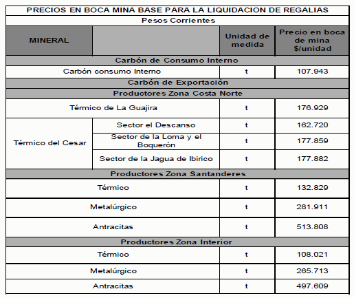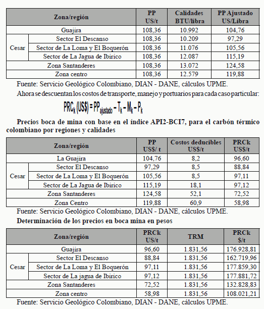 La UPME se encuentra desarrollando un "Estudio para el establecimiento de los precios de los minerales en boca de mina y cálculo de los costos unitarios de producción asociados a la industria minera", el cual será el insumo para actualizar los precios de los minerales base para liquidar regalías. Carbón de Exportación 2. Periodo comprendido entre los meses de junio de 2011 a noviembre de 2011 - Consideraciones iniciales De acuerdo con la metodología establecida en la Ley de Regalías (Ley 141 de 1994) y en las Resoluciones número 181074 del 17 de julio de 2007 y 180507 del 1° de abril de 2009 expedidas por el Ministerio de Minas y Energía, para la fijación del precio del carbón que se destina al mercado externo, se toma como base el promedio ponderado del precio FOB en puertos colombianos, correspondiente al semestre que se liquida, descontando los costos de transporte, manejo y portuarios. - Metodología Se utilizaron dos metodologías independientes; una para el carbón térmico y otra para los carbones metalúrgicos y las antracitas, de acuerdo con las resoluciones emitidas por el Ministerio de Minas y Energía, así: De acuerdo con lo establecido en la Resolución Minminas número 181074 del 17 de julio del 2007, para el cálculo de precio base para la liquidación de regalías del carbón térmico de exportación se utiliza la siguiente fórmula, la cual ha sido adoptada para reflejar las diferentes zonas de procedencia y los tipos de carbón: 5 ) liquidase quei semestredeli mesdelortaciónexpde térmico carbondevolumenporponderado(*)17BC2 API(PP i n1 i i Donde: API 2i: Es el indicador del precio de carbón térmico en US$ por tonelada métrica a 6,000 kcal/kg NAR (que en la fórmula acordada se considerará equivalente a 11,370 BTU/lb GAR) para entregas CIF ARA (Ámsterdam, Rotterdam, Antwerp), publicado semanalmente durante el mes (i) como TFS API2 en el Argus/McCloskey›s Coal Price Index Report. Para efectos de establecer el precio FOB, se realizará el promedio aritmético de los indicadores vigentes semanales en el mes (i). BCI7i: Es el indicador de los valores diarios del flete marítimo entre Puerto Bolívar y Rotterdam, publicados en el SSY Mineral FFA Report, con fuente Baltic Exchange. Para efectos de establecer el precio FOB, se realizará el promedio aritmético de los indicadores vigentes diarios en el mes (i) del semestre que se liquida. n : Es el semestre que se liquida. PP: Corresponde al precio ponderado por volumen de carbón térmico de exportación del mes i del semestre que se liquida: Se obtiene, para el mes i, dividiendo el volumen total de exportación del mes i entre el volumen total de exportación del semestre que se liquida. PRCk (US$): El precio base para la liquidación de regalías de carbón térmico que se dedica al mercado externo, para cada mina, expresado en dólares americanos por tonelada (US$/t), el cual se obtiene restando del precio FOB promedio ponderado en puertos colombianos (PP), los costos de transporte, manejo y portuarios para cada caso particular, y a las que se le aplica la siguiente fórmula: PRCk (US$) = PP - Tk - Mk - Pk Donde: PRCk: Es el precio base para la liquidación de las regalías de carbón térmico para cada mina, expresado en dólares americanos por tonelada (US$/t), para la zona k. PP: Es el Precio FOB promedio ponderado en puertos colombianos para carbón térmico de exportación, expresado en dólares americanos por tonelada (US$/t). Tk: Equivale a los costos de transporte de cada exportador de la región k, tomados desde el borde o boca de mina hasta el puerto colombiano, expresados en dólares americanos por tonelada (US$/ton). Mk: Corresponde a los costos de manejo de cada exportador de la región k expresados en dólares americanos por tonelada (US$/ton). Pk: Corresponde a los costos portuarios de cada exportador de la región k, expresados en dólares americanos por tonelada (US$/ton). De acuerdo con lo establecido en la Resolución Minminas número 80760 de 2001, para el cálculo de precio base para la liquidación de regalías del carbón metalúrgico y antracita de exportación se utiliza la siguiente fórmula, la cual ha sido adoptada para reflejar las diferentes zonas de procedencia y los tipos de carbón: PRCk = PP _ Tk _ Mk _ Pk Donde: PRCk: es el precio base para la liquidación de las regalías de carbón tipo i en la región k, expresado en dólares americanos por tonelada (US$/t). PPi: es el precio promedio FOB del carbón colombiano tipo i en puertos colombianos, expresado en dólares americanos por tonelada (US$/t). Tk: equivale a los costos de transporte desde el borde o boca de mina hasta el puerto colombiano desde la región k, expresados en dólares americanos por tonelada (US$/t). Mk: corresponde a los costos de manejo de cada exportador, expresados en dólares americanos por tonelada (US$/t). Pk: corresponde a los costos portuarios de cada exportador expresados en dólares americanos por tonelada (US$/t). - Fuentes de información consultadas • DANE, volúmenes y valores de exportación por partida arancelaria en dólares y pesos FOB • SIMCO y Banco de la República, para la tasa representativa del mercado TRM. • Ministerio de Transporte, para el valor de las tarifas de los fletes del carbón a diferentes puertos Colombianos SICE. • Sociedades portuarias de Barranquilla, Santa Marta, Buenaventura y Cartagena, para obtener tarifas de uso y manejo en puertos. • Servicio Geológico Colombiano para obtener las calidades por región según la Resolución número 180507 de 2009. • Publicaciones especializadas como Argus y Mc McCloskey para precios de carbón y Baltic Exchange para el valor de fletes marítimos. • Información de gremios como Fenalcarbón Boyacá y Asocarbón y Colcarbex en Norte de Santander. Dentro de las limitaciones actuales en el desarrollo de la estimación del precio base se tienen: • La información disponible de exportaciones (fuente DIAN-DANE) 