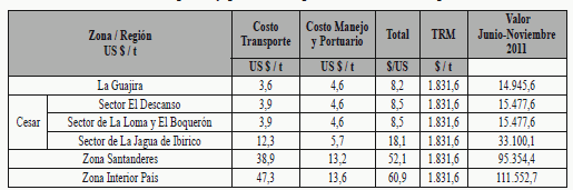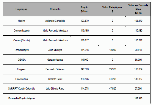 Fuente; Emgesa, Gecelca, Holcim, CEMEX, Termotasajero, GENSA, Smurfit Cartón de Colombia. El precio en boca de mina es el siguiente: