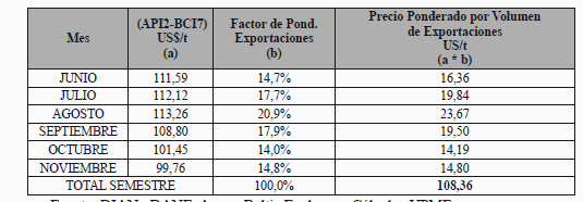 Fuente DIAN-DANE. A estos costos se les aplica la tasa representativa del mercado correspondiente al período de análisis para llegar al precio en boca mina en pesos colombianos.