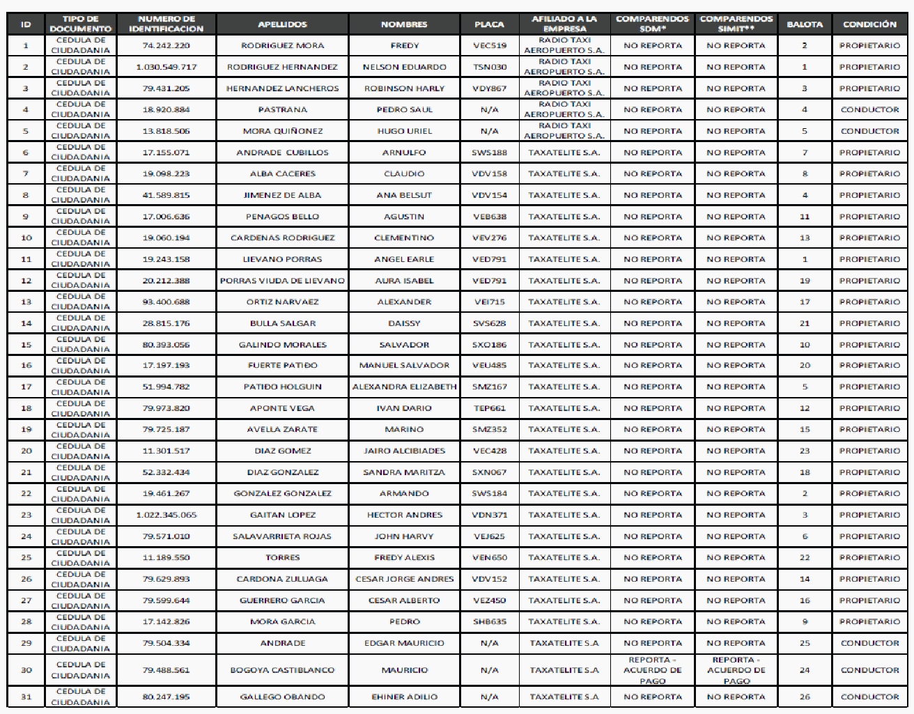 RESOLUCIÓN 324 DE 2012 (Noviembre 27) "Por la cual se asignan los derechos de matrícula temporal de vehículos eléctricos de servicio público individual tipo taxi para la realización de la operación piloto autorizada en los Decretos Distritales 677 de 2011 y 407 de 2012". LA SECRETARÍA DISTRITAL DE MOVILIDAD En ejercicio de sus facultades legales y en especial de las conferidas por la Ley 489 de 1998, el Artículo 108 del Acuerdo 257 de 2006, y el Decreto Distrital 567 de 2006 Articulo 2 y 4; el Decreto Distritales 677 de 2011 modificado por el Decreto Distrital 407 de 2012; y, CONSIDERANDO QUE: 1. Desde la expedición de la Ley 105 de 1993, el ingreso de automotores de transporte público individual puede realizarse por dos vías: por incremento y por reposición. El incremento es cuando el ingreso implica aumento en el número de vehículos de esa modalidad que opera; en la respectiva localidad y la reposición es cuando la vinculación se realiza para sustituir otro vehículo que se encuentre matriculado en el servicio público. 2. El inciso 2 del artículo 6 de la Ley 105 de 1993 establece que "Las autoridades competentes del orden Metropolitano, Distrital y Municipal, podrán incentivar la reposición de los vehículos, mediante el establecimiento de los niveles de servicio diferentes al corriente, que serán prestados con vehículos provenientes de la reposición. Así mismo podrán suspender transitoriamente el ingreso de vehículos nuevos al servicio público de transporte de pasajeros, de acuerdo con las necesidades de su localidad, supeditando la entrada de un vehículo nuevo al retiro del servicio público de uno que deba ser transformado o haya cumplido el máximo de su vida útil…"[1] 3. En atención a la facultad normativa de suspensión transitoria de ingreso de vehículos nuevos al servicio público, el Distrito Capital adoptó el Decreto 613 de 1993, y dispuso que el ingreso de automotores de transporte público individual sólo podía realizarse por reposición. Para ello, deben cumplirse dos condiciones: i) el interesado debe acreditar el retiro simultáneo del servicio en la ciudad de un vehículo clase taxi que haya sido registrado por lo menos cinco años antes; y ii) el vehículo nuevo que se registre debe estar dotado, de equipo y aditamentos que aseguren el mínimo posible de contaminación. 4. El Decreto 519 de 2003, prorrogó indefinidamente la suspensión del ingreso de vehículos por incremento para el servicio público colectivo e individual de pasajeros al Distrito Capital. 5. El Decreto Distrital 677 de 2011 "Por medio del cual se adoptan medidas para incentivar el uso del vehículo eléctrico en el Distrito Capital, se autoriza una operación piloto y se dictan otras disposiciones" estableció en su artículo 3, la operación de 50 vehículos automotores de transporte terrestre público individual de propulsión exclusivamente eléctrica, con una temporalidad de tres (3) años, la cual fue ampliada a cinco (5) años por el Decreto Distrital 677 de 2011, 6. Mediante Resolución No. 280 del 03 de Octubre de 2012 las Secretarias Distritales de Ambiente y de Movilidad definieron los criterios objetivos para la selección en sorteo público las empresas habilitadas en el modo de transporte terrestre automotor público individual en el Distrito Capital, que estén interesadas en participar en la operación piloto autorizada en los Decretos Distritales 677 de 2011 y 407 de 2012. 7. El 12 de Octubre de 2012 se surtió el proceso de Sorteo Público definido en la resolución No. 280 de 2012, que finalizó sin adjudicar matrícula alguna, por lo que se realizó de nuevo, previa expedición de la circular aclaratoria 000008 del 17 de Octubre de 2012, por la cual se aclararon los numerales 2 y 4 del aparte segundo del artículo 3 8. El 29 de Octubre de 2012 siendo las 14:30 horas se realizó el sorteo público (segunda ocasión) para la selección de las empresas habilitadas en el modo de transporte terrestre automotor público individual en el Distrito Capital, que estén interesadas en participar en la operación piloto de cincuenta vehículos automotores tipo taxi de propulsión exclusivamente eléctrica y de cero emisiones en ruta por un término de cinco (5) años 9. Dicha selección en sorteo público se desarrolló con arreglo a los principios del debido proceso, igualdad, imparcialidad, buena fe, moralidad, participación, responsabilidad, transparencia, publicidad, coordinación, eficacia, economía y celeridad. Que en mérito de lo expuesto, RESUELVE: ARTÍCULO 1.- Asignar a los derechos de matrícula temporal por cinco (5) años de treinta y una (31) matrículas temporales de vehículos de servicio público individual tipo taxi, propulsados exclusivamente por energía eléctrica y de cero emisiones en ruta, a: