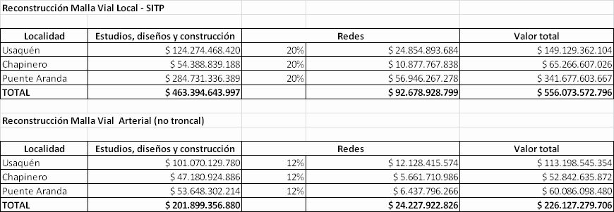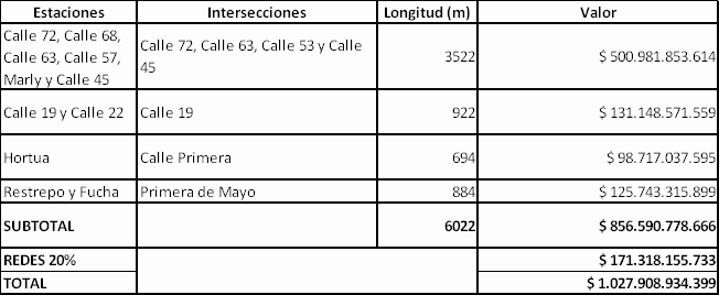 *Este valor no incluye afectación de redes de empresas de servicios públicos, compra de predios requeridos para adecuaciones, cuarto de maquinas, centros de operación, adecuaciones de espacio público, sistema de bombeo e iluminación. Se parte de la premisa que es una estructura en trinchera con zona cubierta únicamente en la intersección.