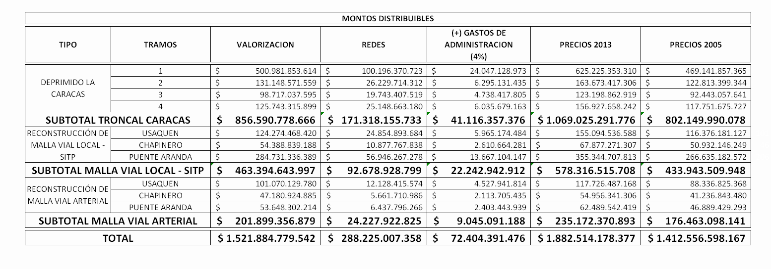Ahora bien, el monto que se financiará a través de la contribución de valorización asciende a $1.882.514.178.377, que expresado en precios de 2005 corresponde a $1.412.556.598.167. A continuación se presenta el cuadro resumen de los montos distribuibles por tipo de obras.