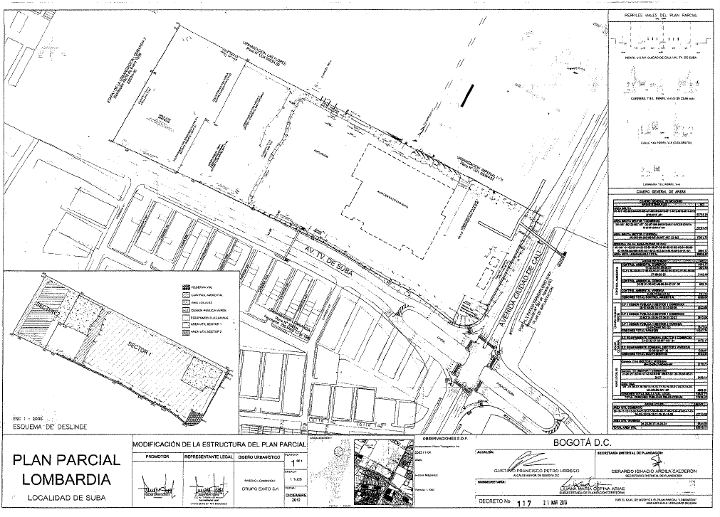 DECRETO 117 DE 2013 (Marzo 21) "Por el cual se modifica el Decreto Distrital 296 de 2002, mediante el cual se adoptó el Plan Parcial Lombardía ubicado en la Localidad de Suba". EL ALCALDE MAYOR DE BOGOTÁ D.C. En ejercicio de sus facultades constitucionales y legales, en especial las conferidas por el numeral 5 del artículo 27 de la Ley 388 de 1997 y los artículos 9 y 16 del Decreto Nacional 2181 de 2006, modificado por el artículo 4 del Decreto 4300 de 2007, y, CONSIDERANDO: Que mediante el Decreto Distrital 296 del 9 de julio de 2002, se adoptó el Plan Parcial para el predio denominado "Lombardía", ubicado en la Localidad de Suba. Que el artículo 32 del citado decreto señaló que "Cualquier modificación total o parcial al planeamiento del presente plan parcial se deberá poner en consideración del Departamento Administrativo de Planeación Distrital" (actualmente Secretaría Distrital de Planeación). Que según lo dispuesto en el artículo 9 del Decreto Nacional 4300 de 2007 "Por el cual se reglamentan las disposiciones relativas a planes parciales de que tratan los artículos 19 y 27 de la Ley 388 de 1997 y el artículo 80 de la Ley 1151 de 2007, se subrogan los artículos 1°, 5°, 12 y 16 del Decreto 2181 de 2006 y se dictan otras disposiciones", señala que "Las modificaciones de un plan parcial estarán sometidas al mismo procedimiento previsto en el Título II del Decreto 2181 de 2006 para su formulación y adopción." Que el inciso 2° del parágrafo del artículo 361 del Decreto Distrital 190 de 2004, Plan de Ordenamiento Territorial de Bogotá, establece que "los predios que se hayan desarrollado sin cumplir con el proceso y obligaciones derivadas del proceso de urbanización, que no se enmarquen dentro del proceso de legalización, se someterán al tratamiento de desarrollo con el fin de hacer exigibles dichas obligaciones". Que en el caso específico del Plan Parcial Lombardía, no se ejecutaron en su totalidad las obligaciones derivadas de la Licencia de Urbanización concedida mediante Resolución 04- 2-0202 del 15/06/2004, en la medida que no se concretó la entrega de las cesiones obligatorias, ni se construyeron los carriles adicionales generados por el proyecto Avenida Ciudad de Cali y por el proyecto Avenida Transversal de Suba. Por esta razón, al presente caso le es aplicable el tratamiento de desarrollo de conformidad con lo estipulado en el literal d) del artículo 3 del Decreto Distrital 327 de 2004 "Por el cual se reglamenta el Tratamiento de Desarrollo Urbanístico en el Distrito Capital", que dispone: "el tratamiento de desarrollo aplica a los predios que se hayan desarrollado sin cumplir con el trámite y obligaciones derivadas del proceso de urbanización". Que conforme las citadas disposiciones, Almacenes Éxito S.A., a través de apoderado y en su calidad de propietario del predio ubicado en la Avenida Carrera 104 No. 145 15 identificado con folio de matrícula inmobiliaria No. 50N-20400428 y Chip AAA0170JHTO, mediante radicado No 1-2009–19920 del 12 de mayo de 2009, presentó solicitud para que se expidieran las determinantes para la modificación del referido Plan Parcial con el fin de modificar la norma de edificabilidad (índice de ocupación y construcción) definidas en el Decreto Distrital 296 del 9 de julio de 2002 Plan Parcial Lombardía con base en las disposiciones contenidas en el Plan de Ordenamiento Territorial. Que mediante oficio No 2-2009-29836 la Dirección de Planes Parciales requirió a los solicitantes para completar la información radicada conforme a lo dispuesto en el artículo 2, numeral 5 del Decreto Nacional 4300 de 2007. Así mismo, se solicitó allegar el poder especial otorgado por quien actúa como representante de la sociedad Almacenes ÉXITO S.A. Que se consideró radicado en legal y debida forma, cuando se aportaron las factibilidades de servicios públicos requeridos, y el poder otorgado al abogado Oscar David Acosta Irreño por parte del señor Juan Hinestrosa Gallego, en calidad de representante legal de la sociedad Almacenes ÉXITO S.A, mediante oficios No. 1-2009-33099, 1-2009-42975 y 1-2009-45185. Que la modificación del Plan Parcial tiene por objeto, redefinir las normas de edificabilidad dispuestas para proyectos comerciales y de servicios de escala metropolitana o urbana, en el Decreto Distrital 296 del 9 de julio de 2002, mediante el cual se adoptó el plan parcial, y en consecuencia asumir el reparto equitativo de cargas y beneficios, establecido en el Decreto Distrital 436 de 2006 para el aumento de edificabilidad. Que la modificación del Plan Parcial Lombardía, actualiza el trazado de la zona de reserva vial de la intersección de la Avenida Ciudad de Cali por Avenida Transversal de Suba, teniendo en cuenta los nuevos diseños previstos por la Secretaría Distrital de Planeación mediante Resolución No 781 del 18 de agosto de 2006. Que la Dirección de Planes Parciales de la Secretaría Distrital de Planeación, en el Comité Técnico de Planes Parciales del 16 de octubre de 2009, solicitó a las empresas y entidades distritales la expedición de los conceptos técnicos correspondientes, los cuales se emitieron así:
