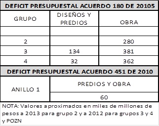 Durante la etapa de preinversión y de estructuración de los proyectos (Factibilidad), con los estudios previos y actividades que generan un nivel de información, se ha analizado la inviabilidad del Plan de Obras del Acuerdo 180 de 2005 y del Acuerdo 451 de 2010, en razón a que no se pueden cubrir los sobrecostos por las complejidades presupuestales