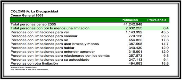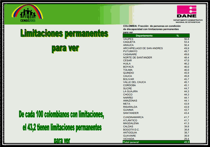 Entre los departamentos, cercanos al distrito capital, con mayor porcentaje de personas con discapacidad que poseen limitaciones permanentes para ver se encuentran: Boyacá con el 46% Tolima con el 46% Cundinamarca con el 41% Bogotá con el 38% Como lo vemos a continuación: TABLA No 2. DEPARTAMENTOS CON MAYOR PORCENTAJE DE PERSONAS CON LIMITACIONES PERMANENTES PARA VER29