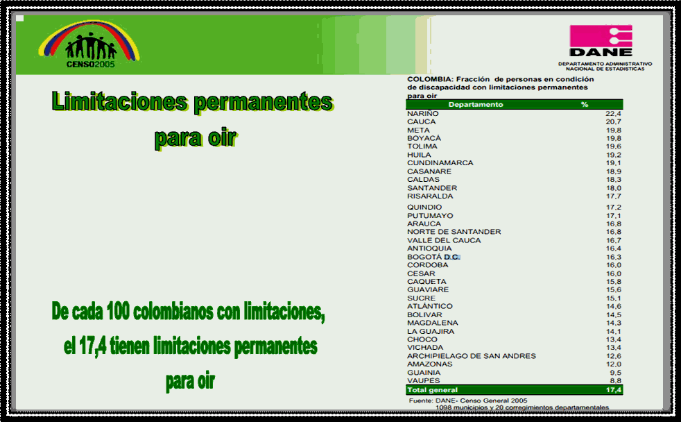 Entre los departamentos, cercanos al distrito capital, con mayor porcentaje de personas con discapacidad que poseen limitaciones permanentes para oír se encuentran: Boyacá con el 19% Tolima con el 19% Cundinamarca con el 19% Bogotá con el 16% TABLA No 3. DEPARTAMENTOS CON MAYOR PORCENTAJE DE PERSONAS CON LIMITACIONES PERMANENTES PARA OIR30