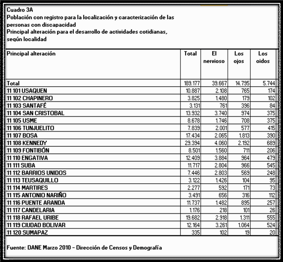 B. SITUACION DE LAS PERSONAS CON LIMITACIONES VISUALES Y AUDITIVAS EN BOGOTA Según Censo DANE Marzo 2010, en lo que respecta a la población con discapacidad visual y auditiva se tiene que: En Bogotá existen 20.539 personas con limitaciones visuales y auditivas. En Bogotá predomina la alteración en el sistema nervioso (39.667 personas) y en segundo lugar predomina la alteración en el sistema visual (14.795 personas) Existen un Total de 14.795 personas con algún tipo de discapacidad visual en Bogotá. Del total de las Personas con algún tipo de discapacidad visual tenemos que las Localidades con mayor preeminencia de esta Población están ubicadas en Bosa, Kennedy, Rafael Uribe y Ciudad Bolívar. La localidad con mayor número de personas con limitación visual es Kennedy con 2.192 personas. En Bogotá existen un total de 5.744 personas con discapacidad auditiva. Las Localidades que tienen más habitantes con discapacidad auditiva son: Kennedy, Suba, Engativá, Rafael Uribe Uribe, Ciudad Bolívar. La localidad con mayor número de personas con limitación auditiva es Kennedy. Lo anterior lo vemos desarrollado en el siguiente cuadro: TABLA No 4. PRINCIPAL ALTERACION PARA EL DESARROLLO DE ACTIVIDADES COTIDIANAS SEGÚN LOCALIDAD31
