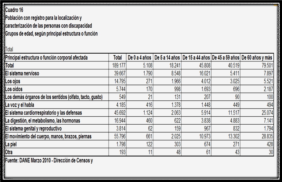 TABLA No 5. POBLACION CON REGISTRO PARA LA LOCALIZACION DE LAS PERSONAS CON DISCAPACIDAD. GRUPOS DE EDAD, SEGÚN PRINCIPAL ESTRUCTURA O FUNCION 32