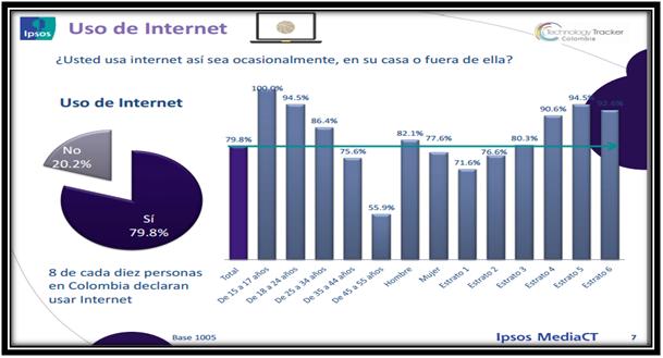 Según el estudio realizado por IPSOS MEDIA CT TECHTRACKER en octubre de 2012 acerca de la Representatividad Nacional en términos de medición de las nuevas tendencias y desarrollos en tecnologías por las diferentes regiones nacionales, tenemos que a partir de la muestra estipulada en este estudio el 80% de la población en Colombia SI ha utilizado Internet; las tendencias de uso en el nivel nacional las encontramos en personas en edades entre 15 y 44 años pertenecientes a todos los estratos y géneros. También es posible establecer que 8 de cada 10 personas en Colombia declaran usar internet. 36Como lo vemos a continuación: GRAFICA No 1 USO DE INTERNET37
