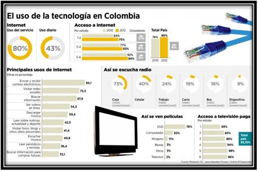 Fuente: Estudio IPSOS MEDIA CT TECHTRACKER. Octubre de 2012. pág. 9 También, al consultar el diario del Espectador el día 14 de Febrero de 2013 tenemos que en Colombia "Según estudio, el 80% de los colombianos accede a internet. El Ministerio de las TIC y la firma Ipsos Napoleón Franco le midieron el pulso al consumo de tecnología en un país en el que los estratos bajos suman nuevas conexiones y los altos concentran el acceso a redes sociales."39 GRAFICA No 3 EL USO DE LA TECNOLOGIA EN COLOMBIA40