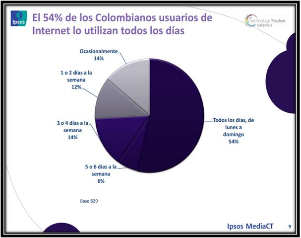 Fuente: Estudio IPSOS MEDIA CT TECHTRACKER. Octubre de 2012. pág. 7 Así mismo, el 54% de los colombianos son usuarios de internet y lo utilizan todos los días de lunes a domingo como lo vemos en el siguiente cuadro: GRAFICA No 2 PORCENTAJE DE COLOMBIANOS USUARIOS DE INTERNET38