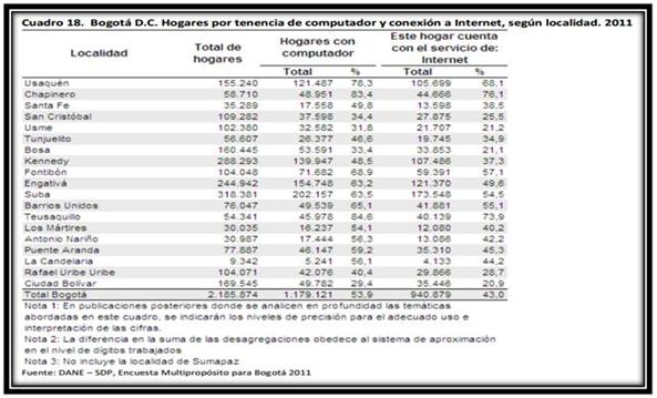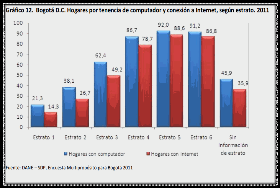 Fuente: Consultado en Diario el Espectador. 14 Feb 2013 - 8:44 pm. Radiografía de la sociedad digital. En Colombia, vemos que los principales medios para acceder a la información son la radio, la televisión, la telefonía y el acceso a internet. Este último, es muy importante ya que se puede utilizar para acceder a correos electrónicos, visitar redes sociales, buscar información de diferente índole, ver videos en línea, descargar música, leer sobre noticias, visitar foros, leer periódicos y revistas, realizar trámites con entidades públicas, financieras y comerciales, entre otros. En este punto, se manifiesta la necesidad y la importancia que tienen estas herramientas e instrumentos tecnológicos para que cualquier persona independientemente de su edad, género, estrato socio-económico y condición pueda acceder a la información, y la ponga al alcance de todos. En este sentido, el acceso universal a la información debe ser uno de los prerrequisitos en el uso de Internet; cuando no existe accesibilidad universal caemos en círculo de la exclusión y/o discriminación digital y virtual. Por esta razón "…Hablar de inclusión social a través de las TIC, requiere pensar en su opuesta: la exclusión social a través de las TIC; fenómeno que, por su naturaleza, pareciera darse de forma multidimensional. La exclusión digital se apoya en factores como la discrepancia en la infraestructura, la desigualdad en los recursos económicos entre las diferentes poblaciones y regiones, del mismo modo que entre las zonas urbanas y las rurales; la edad, siendo el factor generacional muy importante, debido a la tendencia a que las personas más jóvenes sean quienes, en mayor medida, utilizan las innovaciones tecnológicas, a diferencia de algunas personas mayores a las que se les dificulta esta inclusión; el género, las personas con discapacidad, el territorio, la educación, entre otros…"41 Por otro lado, ya habiendo estudiado la cobertura de la población objetivo (Personas con discapacidad visual y auditiva) en la Ciudad de Bogotá, es decir, ya después de haberla caracterizado según los censos y la información recolectada, es importante analizar el tema de la cobertura actual en computadores y acceso a la red de Internet en la ciudad de Bogotá para así obtener una mirada más objetiva y especifica del impacto que tiene la implementación de esta iniciativa. En primer lugar, tenemos una gráfica que manifiesta información acerca de los hogares que poseen por lo menos un computador para desarrollar labores de diferente índole. Esto es con el fin de demostrar que la tenencia de las personas en la utilización de este medio tecnológico (computador) se está incrementando cada vez más y esto evidencia la necesidad de promover la inclusión a través de estos artefactos. TABLA No 6 HOGARES POR TENENCIA DE COMPUTADOR Y CONEXIÓN A INTERNET SEGÚN LOCALIDAD 2011 42