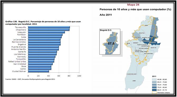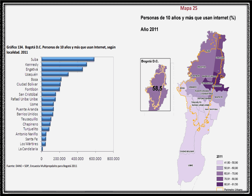 FUENTE: Encuesta Multipropósito para Bogotá año 2011 Observamos que en Localidades como Teusaquillo, Chapinero, Usaquén, Fontibón, Suba son las tendencias por ubicación geográfica más marcadas en donde las personas mayores de 10 años de edad usan computador. Pero promediando tenemos que en todas las Localidades existe la posibilidad de tener acceso a un computador. Del mismo modo, si contrastamos el cuadro anterior con el siguiente denominado "Uso de internet", tenemos que las Localidades que más usan el internet son: Suba, Kennedy, Engativá, Usaquén. Pero si miramos los avances en tecnología en términos de cómputo, acceso a servicios de internet, vemos que son más fáciles de tener, por tal motivo estas cifras si las analizamos a 2013 aumentarían de manera desproporcional. INTERNET SEGÚN LOCALIDAD 2011 44