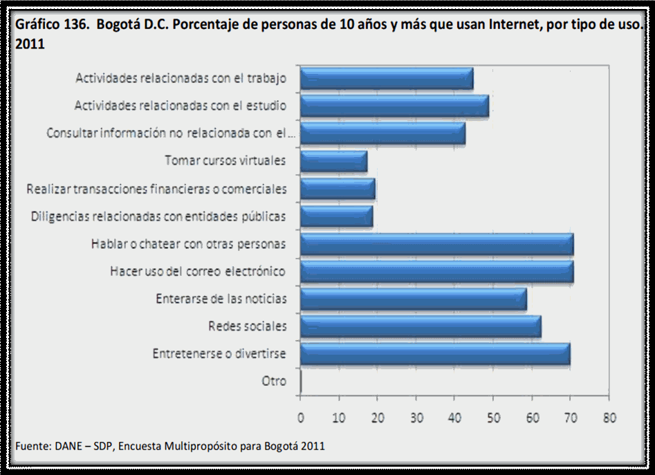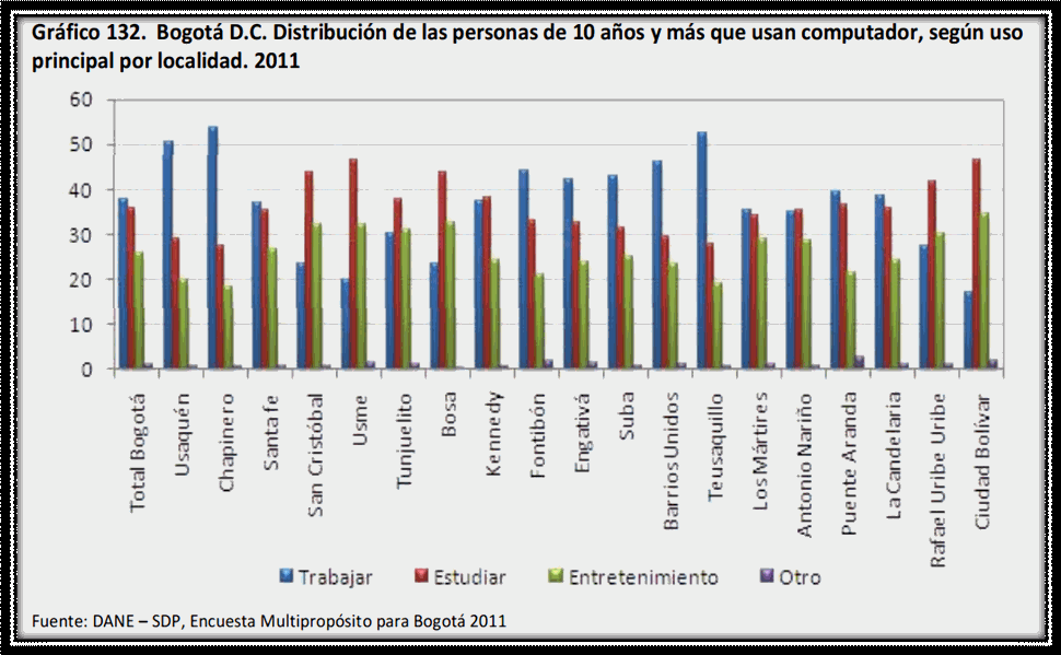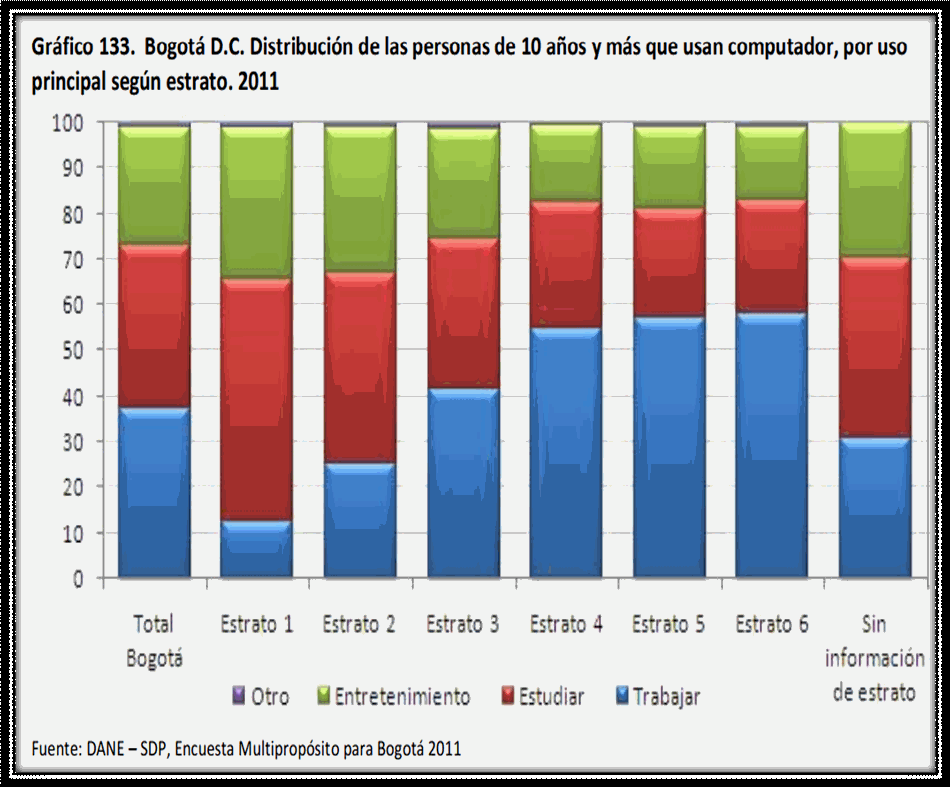 FUENTE: Encuesta Multipropósito para Bogotá año 2011 Los hogares promedio los cuales tienen acceso a computador y a internet al mismo tiempo los encontramos en estratos 4, 5, 6. En el otro lado de la moneda vemos grandes falencias en estratos 1, 2, 3 ya que existe la posibilidad de tener un computador más no la tendencia muy marcada de optar por internet también. Lógicamente, si miramos el boom que ha tenido Colombia en el acceso a este tipo de servicios, podríamos decir que a 2013 estas cifras en estratos bajos han aumentado el acceso a internet también. En cuarto lugar de acuerdo al siguiente cuadro, vemos que los principales usos que se le dan a un computador en Bogotá son: para trabajar, para estudiar, para entretenimiento entre otros. Las Localidades donde más se utiliza el computador para trabajar son: Usaquén, Chapinero, Teusaquillo, Kennedy, Fontibón, Engativá, Suba, Barrios Unidos; Así mismo, las localidades que utilizan mayormente el computador para estudiar tenemos a Ciudad Bolívar, San Cristóbal, Usme, Bosa, Rafael Uribe. Como lo vemos a continuación: