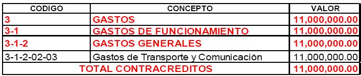 ARTÍCULO SEGUNDO: Efectúese un CONTRACRÉDITO en el Presupuesto de Gastos de Funcionamiento del Fondo de Desarrollo Local de Chapinero de la vigencia 2013 en la suma de ONCE MILLONES DE PESOS ($11.000.000,00), de acuerdo con el siguiente detalle:CONTRACRÉDITOS