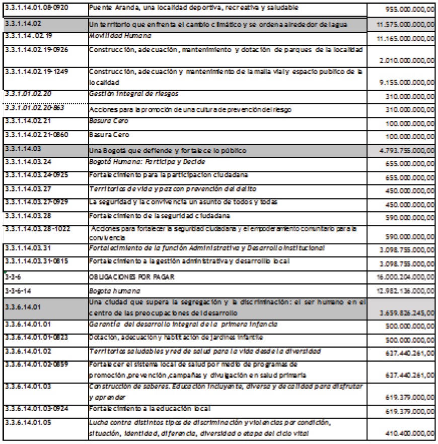 DECRETO LOCAL 010 DE 2013 (Diciembre 26) Corregido por el Decreto Local 011 de 2013. Decreto "Por el cual se corrige el decreto 09 mediante el cual se liquido el Presupuesto Anual de Ingresos y Gastos de la Alcaldía Local de Puente Aranda, para la vigencia fiscal comprendida entre el 1º de enero y el 31 de diciembre del 2014" EL ALCALDE LOCAL DE PUENTE ARANDA En uso de sus facultades legales y en especial la que le confiere el artículo 19 del Decreto 372 de 2010. CONSIDERANDO: Que efectuada la revisión del Decreto 09 de 2013, se determino que se hace necesario efectuar una corrección al Decreto 09 de 2013. Que se hace necesario incluir dentro del Decreto de liquidación los rubros discriminados de las obligaciones por pagar tanto de funcionamiento como de Inversión. Que se cometieron algunos errores de trascripción en la imputación de algunos rubros, por lo cual se hace necesario ajustar al plan de cuentas vigente. Que el Alcalde Local de Puente Aranda presentó el proyecto de presupuesto a nivel de agregados para estudio y aprobación de la Junta Administradora Local dentro del término establecido en el artículo 15 del Decreto 372 de 2010. Que la JUNTA ADMINISTRADORA LOCAL radico dentro del tiempo establecido el Acuerdo local de presupuesto. Que mediante Acuerdo Local 003 del 15 de Diciembre, la Junta Administradora Local aprobó el presupuesto anual de ingresos y gastos para la vigencia fiscal comprendida entre el 1 de Enero y el 31 de Diciembre de 2014. Que en virtud de lo establecido en el artículo 19 de decreto 372 de 2010, el alcalde debe liquidar el presupuesto anual de ingresos y gastos a nivel de programas y proyectos. Que en mérito de lo expuesto, DECRETA: ARTÍCULO 1.- Corregir el decreto 09 de 2013 mediante el cual se fijo el Presupuesto Anual de Ingresos de la Alcaldía Local de Puente Aranda para la vigencia fiscal comprendida entre el 1º de enero al 31 de diciembre de 2014, por la suma de TREINTA Y OCHO MIL TRESCIENTOS SESENTA Y CINCO MILLONES SEISCIENTOS OCHENTA PESOS MCTE($38.365.680.000), conforme al siguiente detalle: DISTRIBUCIÓN DE INGRESOS