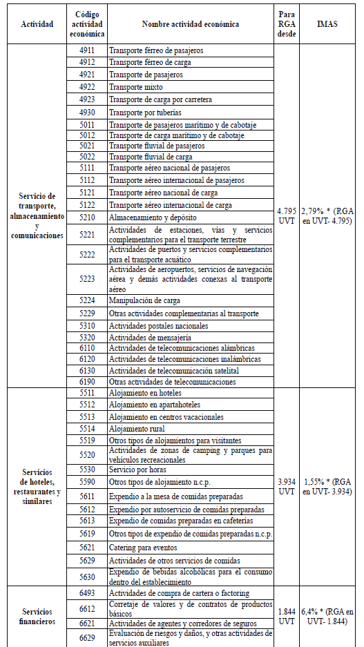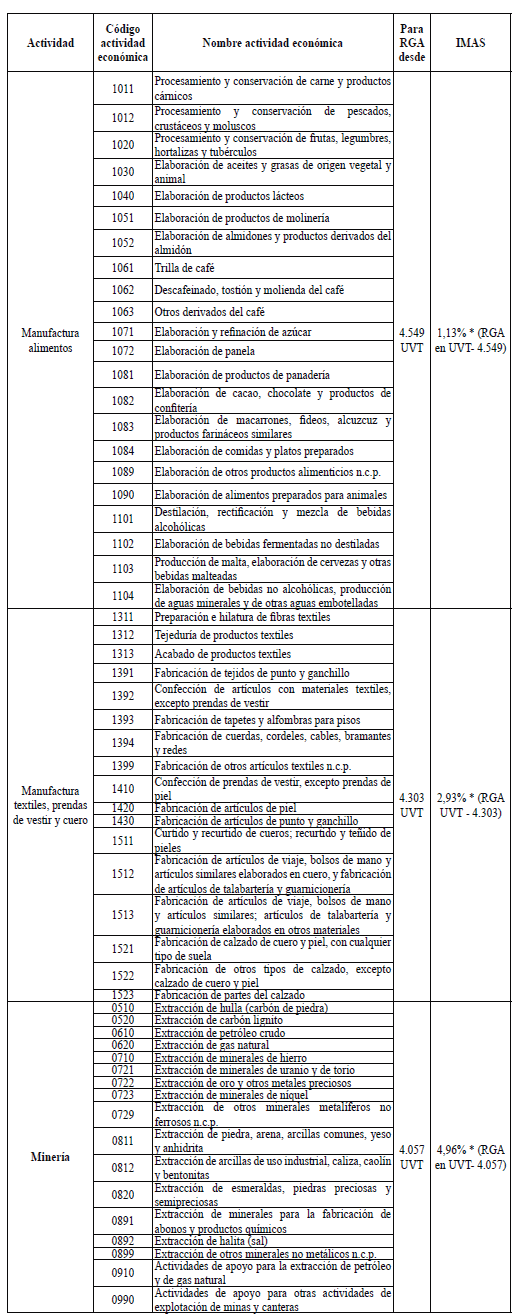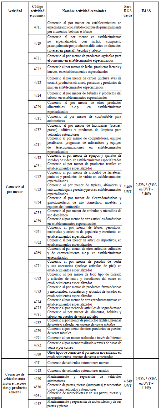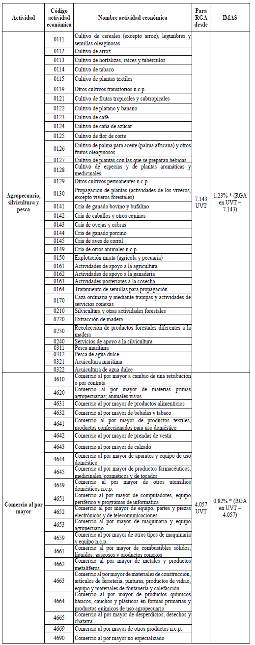 Artículo 1°. Para efectos de lo dispuesto en el Capítulo II del Título V del Libro Primero del Estatuto Tributario, las actividades económicas de que trata el artículo 340, comprenden las actividades económicas según la clasificación CIIU Rev. 4 A.C. contenidas en la siguiente tabla de correspondencias: