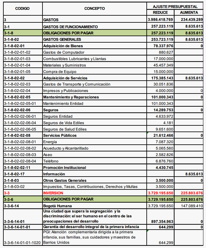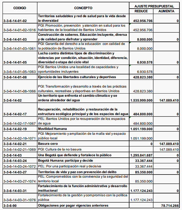DECRETO LOCAL 001 DE 2015 (Marzo 03) Por el cual se ajusta el Presupuesto Anual de Ingresos y Gastos del Fondo de Desarrollo Local de Barrios Unidos para la vigencia fiscal 2015. EL ALCALDE LOCAL DE BARRIOS UNIDOS En ejercicio de sus atribuciones constitucionales y legales y en especial las que le confiere el artículo 36 del Decreto 372 de 2010, y CONSIDERANDO: Que el Decreto 372 del 2010 en su artículo 36 estipula que los F.D.L. efectuarán el ajuste presupuestal por cierre de la vigencia anterior mediante decreto local previa la viabilidad presupuestal de la Secretaría Distrital de Hacienda – Dirección Distrital de Presupuesto. Que en la Resolución No. SDH-000226 de 2014, sobre el Ajuste por Cierre Presupuestal se indica el procedimiento para efectuar el ajuste en mención. Que una vez efectuado el cierre presupuestal de la vigencia fiscal de 2014, se determinó un monto de obligaciones por pagar de $14.355.562.520 y un saldo real en caja certificado por la Tesorería Distrital de $16.394.097.897. Que el Fondo de Desarrollo Local de Barrios Unidos apropió en la vigencia 2015 Obligaciones por Pagar por $18.107.542.000. Que el Fondo de Desarrollo Local debe ajustar los rubros 3.1.8 y 3.3.6 Obligaciones por Pagar del Presupuesto aprobado para la vigencia fiscal 2015 a las realmente constituidas a 31 de diciembre de 2014. Que el 27 de febrero de 2015, la Secretaría Distrital de Hacienda – Dirección Distrital de Presupuesto, mediante comunicación No.2015EE35089 emitió concepto favorable para efectuar el ajuste presupuestal del Fondo de Desarrollo Local. Que mediante comunicación No. 2-2015-06291 del 17 de febrero de 2015, la Secretaría Distrital de Planeación emitió concepto favorable para el trámite del ajuste presupuestal del Fondo de Desarrollo Local. En mérito de lo expuesto, DECRETA: ARTÍCULO PRIMERO. Ajustar el presupuesto de Gastos del Fondo de Desarrollo Local de Barrios Unidos, para la vigencia fiscal de 2015, conforme al siguiente detalle: