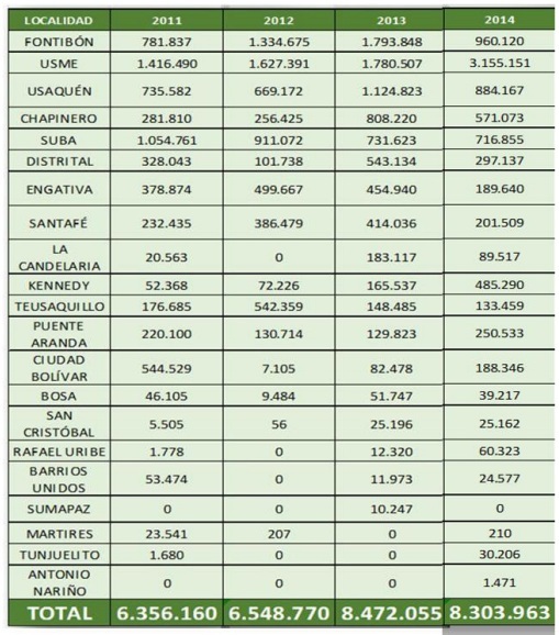 En el año 2012 se obtuvieron datos para el control a la generación de RCD en 14 localidades del Distrito Capital, para el 2014 estos datos permitieron el control a 19 localidades con un mínimo de generación de 210 toneladas de RCD. Las localidades en el sur de la ciudad presentaron en promedio una generación mensual de 15.612 toneladas de RCD, en las localidades ubicadas al norte de la ciudad tienen en promedio de generación y control mensual de 37.763 toneladas de RCD. Por lo que se evidenció que la generación de estos residuos al norte de la Capital duplican los valores de las obras ubicadas en el sur.