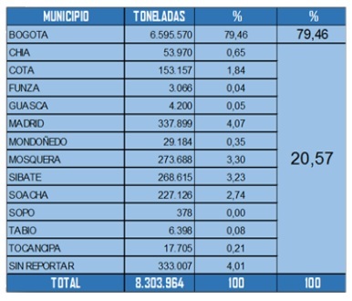 Como se observa en la siguiente tabla el 79.46%, 6.595.570 Ton de los RCD son dispuestos en el perímetro urbano de la capital. El 20.57% que equivale a 1.708.395 toneladas de RCD de los residuos generados en la capital son dispuestos en predios localizados en municipios cercanos a Bogotá.