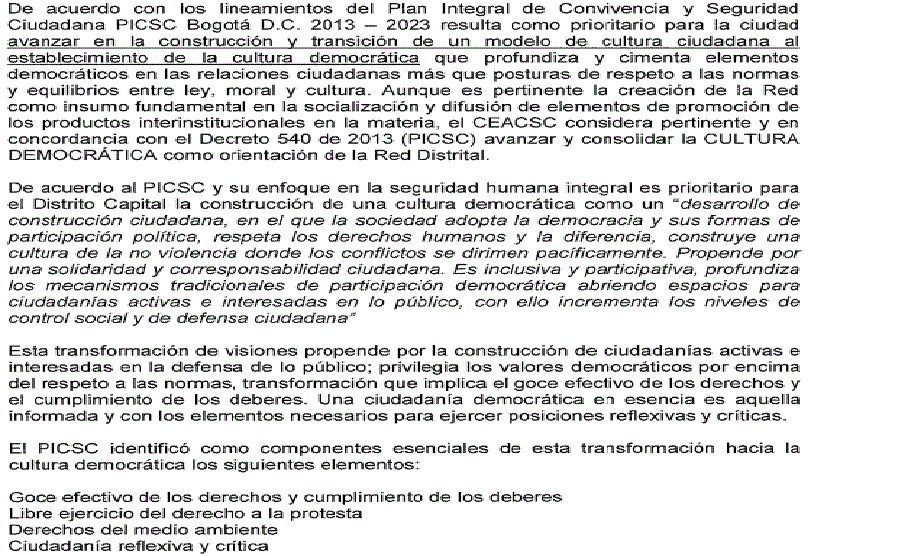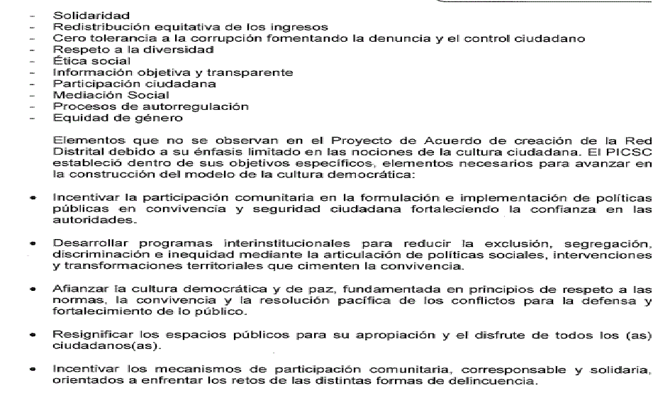Red Distrital de Cultura Ciudadana y Democrática de Bogotá, que debe tener un carácter transectorial (sociedad civil y administración pública Distrital), transversal (concurrencia de distintas disciplinas, sectores o instituciones) e interinstitucional (articulación y complementariedad entre las instituciones Públicas Distritales) y Permanente (que trascienda las Administraciones Distritales), para lograr reconstruir el tejido social.