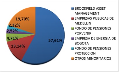 Figura 1. Participación accionaria Esta participación no le otorga a EEB ningún otro beneficio diferente a la recepción de los dividendos a que haya lugar según las políticas de distribución de dividendos que establezca ISAGEN, las cuales se prevé pueden ser modificadas de manera importante con la toma de control del nuevo inversionista. La coyuntura actual ofrece la oportunidad de llevar a cabo la desinversión en ISAGEN aprovechando el precio por acción de la adjudicación de $4.130. La Figura 2 ilustra el comportamiento histórico de la política de dividendos de ISAGEN. La distribución de dividendos en promedio es de alrededor del 40% de las utilidades, lo cual implica una alta tasa de retención que soporta nuevas inversiones, incluyendo Hidrosogamoso y Amoyá y/o busca alcanzar un nuevo objetivo en términos de su estructura de capital. Estos objetivos o alineamiento estratégico seguramente van a ser objeto de revisión por parte del nuevo inversionista controlante orientado a maximizar su propio beneficio.