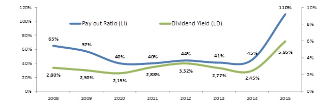 A pesar de la consistencia operativa, los principales múltiplos de valoración muestran como el precio de la acción es alto, en términos relativos, lo cual es consistente con una estrategia de venta del activo. El precio de la acción en relación con las utilidades, con el valor en libros y con el flujo de caja es históricamente superior. Consistente con lo anterior, el rendimiento por dividendos ha disminuido drásticamente en el último año. Tabla 3. Múltiplos de Valoración