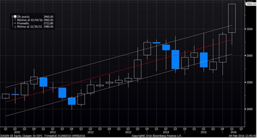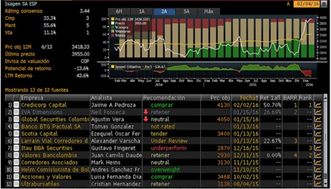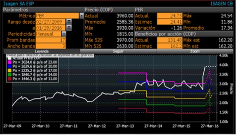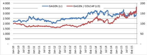 Fuente: Bloomberg, Cálculos EEB Figura 4. Comportamiento Histórico del Precio de la Acción de ISAGEN relativo al COLCAP Los anteriores resultados son consistentes con la recomendación de diferentes analistas del mercado, como se observa en la siguiente tabla. Desde el mes de diciembre de 2015, como consecuencia de la expectativa por el cierre de la venta de ISAGEN por parte del gobierno, los analistas recomiendan mantener el activo hasta que el precio llegue a niveles de $3.900. Si el precio supera este nivel, la recomendación es la venta para la toma de utilidades.