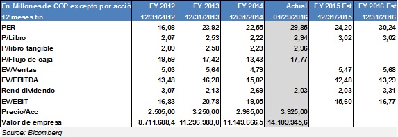 Para validar la consistencia de los múltiplos con el precio de valoración, se realizó un pronóstico de precio con base en el indicador Relación Precio Utilidades (PER * Price Earnings Ratio o P/E) el cual nos indica la relación existente entre el precio de la acción y las utilidades por acción. La utilidad por acción en 2014 fue de $131,48 y se espera que esta utilidad se incremente en 2015 llegando a niveles de $162,2. De la anterior información se infiere el rango de valoración del precio de la acción entre $1.500 y $4.000 para niveles de PER entre 11 y 24,41. Este último valor del indicador es el esperado por el mercado. Del anterior análisis se obtienen que a pesar de una expectativa de un PER relativamente alto, el pronóstico del precio no alcanza en ningún caso, los niveles de la OPA, es decir $4.130.
