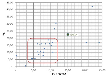 Fuente: Bloomberg Figura 5. Precio de ISAGEN implícito con base en PER Múltiplos de Valoración Empresas Comparables en Otros Mercados A partir de una muestra seleccionada por Bloomberg de 30 empresas con características similares a nivel global, se realizó un análisis comparativo con base en los múltiplos EV/EBITDA y PER. El resultado fue consistente con el análisis técnico y fundamental. Los múltiplos de valoración de ISAGEN son relativamente altos, lo que significa que el precio de valoración es superior al de las empresas pares dentro del mercado global. Los múltiplos PER de las empresas analizadas se concentran entre los valores 5 y 20; mientras que el de ISAGEN se ubica en un nivel muy superior (22,55). Consistentemente, el múltiplo al EV / EBITDA de ISAGEN es de 15 mientras el mercado se ubica en un rango entre 4 y 11.