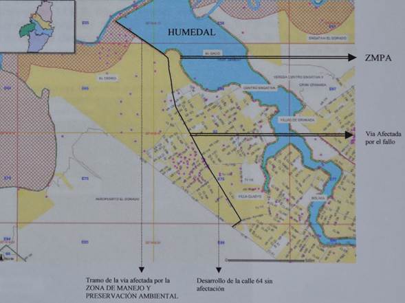 Con fundamento en un gráfico de la localización del humedal Jaboque y su respectiva zona de manejo y preservación ambiental (ZMPA), manifiesta“…que la vía objeto de controversia no se encuentra afectada por la ZMPA, tal como se afirma en el documento de la sentencia, y es tanto así, que verificado el uso del suelo existente para la ciudad establecido en el POT, se establece en gran parte para el sector el uso de suelo como VIVIENDA CON ACTIVIDAD ECONÓMICA. Por otra parte, es totalmente claro, que como se afirma en la contestación de la demanda por la EAAB, la vía finaliza en la ZMPA, y de este punto en adelante, si se quiere consolidar la vía se requiere un manejo especial, por sus condiciones ambientales. El Tribunal aseveró que existía un conflicto sobre dos derechos, la protección del ambiente y la seguridad de las personas que transitan por la calle 64 entre la Cr 114 y el río Bogotá. Y BAJO ESTA PREMIZA, SEFUNDAMENTÓ LA EQUIVOCADA SUPOSICIÓN QUE LA VÍA SE ENCONTRABA SOBRE LA ZMPA DEL HUMEDAL JABOQUE, con lo cual se desencadena el fallo que obliga a cerrar la vía en el sector y modificar su uso a recreación pasiva. Fallo que se confirma en segunda instancia.”[3] (Negrillas fuera del texto).