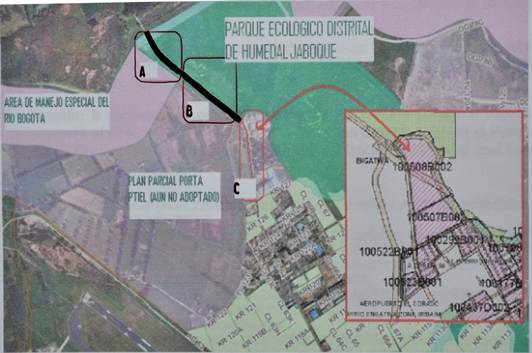 Con fundamento en la gráfica denominada “Fig. 7 Localización Calle 64 entre Carrera 127 y río Bogotá”, se pronuncia sobre la afectación del humedal Jaboque, divide el trayecto en tres secciones[8] identificadas con las letras A, B y C, y afirma que “…La sección A está en su totalidad inmersa en el Área de Manejo Especial del río Bogotá…”, “…La Sección B contiene dos porciones diferentes: La primera porción o superior corresponde al sistema de áreas protegidas del orden distrital como es el Parque Ecológico Distrital Humedal Jaboque (Art. 95 del Decreto 190/04), en cual tiene el siguiente uso… La segunda porción o inferior que se señala en la Figura 7, corresponde al proyecto Plan Parcial Porta – PTIEL, el cual a la fecha no ha sido adoptado. Cabe mencionar que la porción de la vía en cuestión aparece en el ortofotomapa justo en la sección que corresponde a los límites del humedal.”.