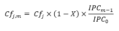pesos por factura, correspondiente al mes Cfj: Costo base de comercialización para cada mercado de comercialización j, expresado en pesos por factura, calculado conforme al artículo 6 de esta resolución. IPCm-1: Índice de precios al consumidor reportado por el DANE para el mes m-1. IPC0: Índice de precios al consumidor reportado por el DANE para diciembre de 2013. X: Factor de productividad acumulado para la actividad de comercialización de energía eléctrica. Durante el primer año calendario de vigencia de la metodología esta variable tendrá un valor igual a cero, el cual se incrementará en 0,00725 cada año calendario.