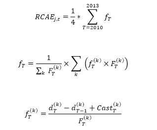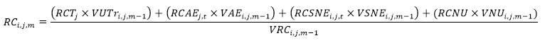 T: Corresponden los años 2010 a 2013. K: Categoría de tipo de usuario. Esta variable corresponderá a usuarios ubicados en: barrios subnormales, SN, áreas rurales de menor desarrollo, MD, y zonas de difícil gestión, DF. A partir del segundo año calendario de entrada en vigencia de la presente metodología, en los mercados de comercialización para los cuales se apruebe un valor de la variable RCAEj,t mayor o igual a 10,0% se deberá aplicar la siguiente ecuación: