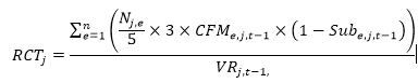 Donde: RCTj: Prima por el riesgo de cartera no gestionable de los usuarios tradicionales del mercado de comercialización j. Nj,e: Número de usuarios a los que se les cortó y no se les restableció el servicio en el estrato o sector de consumo e, del mercado de comercialización j, para el periodo 2009 a 2013. CFMe,j,t-1: Consumo facturado medio para el estrato o sector de consumo e, en el mercado de comercialización j. Calculado como las ventas totales en kWh divididas entre el total de facturas, para el año t‑1. Sube,j,t-1: Relación entre los subsidios y el total facturado en el estrato o sector de consumo e, del mercado de comercialización j, para el año t‑1. VRj,t-1: Ventas totales a usuarios regulados en el mercado de comercialización j, para el año t‑1, expresadas en kWh. t - 1: Corresponde al año 2013. En la solicitud de que trata el artículo 21 de esta resolución, los agentes comercializadores deberán suministrar la información requerida para realizar el cálculo de la variable RCTj de acuerdo con lo establecido en este numeral. En el caso de los mercados de comercialización para los que el comercializador integrado con el operador de red no reporte la información, la variable RCTj tendrá un valor máximo igual al 90% del menor riesgo calculado, diferente de cero, para los demás mercados de comercialización. 2. Variable RCAEj,t La variable RCAEj,t será calculada para cada mercado de comercialización j, conforme a las siguientes ecuaciones: