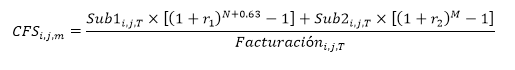 Donde: CFSi,j,m: Costo financiero asociado al giro de los subsidios al comercializador deficitario i, en el mercado de comercialización j, aplicable en el mes m. Este factor será igual a cero cuando en la última validación trimestral realizada por el Ministerio de Minas y Energía, el comercializador i, en el mercado de comercialización j, sea superavitario. T: Últimos cuatro trimestres para los cuales el Ministerio de Minas y Energía ha realizado el giro de los subsidios al comercializador i, en el mercado de comercialización j. N: Promedio del número de meses transcurridos desde la finalización de los trimestres T hasta el giro de los subsidios de esos trimestres para el comercializador deficitario i, en el mercado de comercialización j. En el caso de que un comercializador sea superavitario y se vuelva deficitario el valor de N deberá ser igual a 1,5. r1 Costo de oportunidad mes vencido, calculado como el promedio semanal de las tasas de interés preferencial o corporativo, de los créditos comerciales, vigentes a partir del segundo mes del último trimestre de T y hasta el mes anterior al mes de giro de subsidios por parte del Ministerio de Minas y Energía. La fuente de información será la publicada por el Banco de la República de acuerdo con el formato 088 de la Superintendencia Financiera de Colombia. Sub1i,j,T: Valor promedio del déficit de subsidios causados y no pagados una vez finalizado cada trimestre, de acuerdo con las validaciones realizadas por el Ministerio de Minas y Energía, de conformidad con el artículo 5 del Decreto 847 de 2001 o aquel que lo modifique, complemente o sustituya, para el comercializador i, en el mercado de comercialización j, para los trimestres T. M: Promedio del número de meses de pago anticipado respecto de la finalización de los trimestres T para el comercializador deficitario i, en el mercado de comercialización j. r2: Costo de oportunidad mes vencido, calculado como el promedio semanal de las tasas de los Certificados de Ahorro a Término, vigentes a partir del segundo mes del último trimestre de T y hasta el mes anterior al mes de giro de subsidios por parte del Ministerio de Minas y Energía. La fuente de información será la publicada por el Banco de la República de acuerdo con el formato 088 de la Superintendencia Financiera de Colombia. Sub2i,j,T: Valor promedio del déficit de subsidios pagados antes de finalizar cada trimestre, de acuerdo con las validaciones realizadas por el Ministerio de Minas y Energía, de conformidad con el artículo 5 del Decreto 847 de 2001 o aquel que lo modifique o sustituya, para el comercializador i, en el mercado de comercialización j, para los trimestres T. Facturacióni,j,T: Corresponde a la facturación por concepto de ventas de energía realizadas por el comercializador i, en el mercado de comercialización j, para los trimestres T. Esta facturación debe coincidir con lo reportado al Sistema Unificado de Información, SUI, para usuarios regulados en los formatos 2 y 3 de la Resolución SSPD 20102400008055 o aquella que la modifique, complemente o sustituya. Artículo 19. Costo de garantías financieras en el MEM, CGi,m-1. El costo a reconocer por las garantías financieras constituidas ante el Mercado Mayorista en cumplimiento de la Resolución CREG 019 de 2006, o aquella que la modifique, complemente o sustituya, será el declarado por el comercializador i a la SSPD, para el mes m - 1. La declaración de estos costos a la SSPD deberá realizarse a más tardar el último día hábil del mes m - 1, y deberá estar acompañada por una copia de las garantías constituidas por el comercializador para realizar la cobertura de las transacciones en el mes m – 1. Adicionalmente, dicha información deberá ser publicada en la página web de cada comercializador, en la misma fecha de reporte a la superintendencia. Artículo