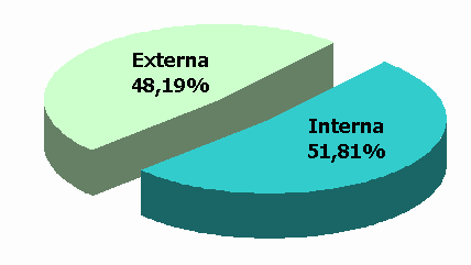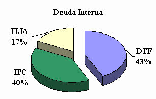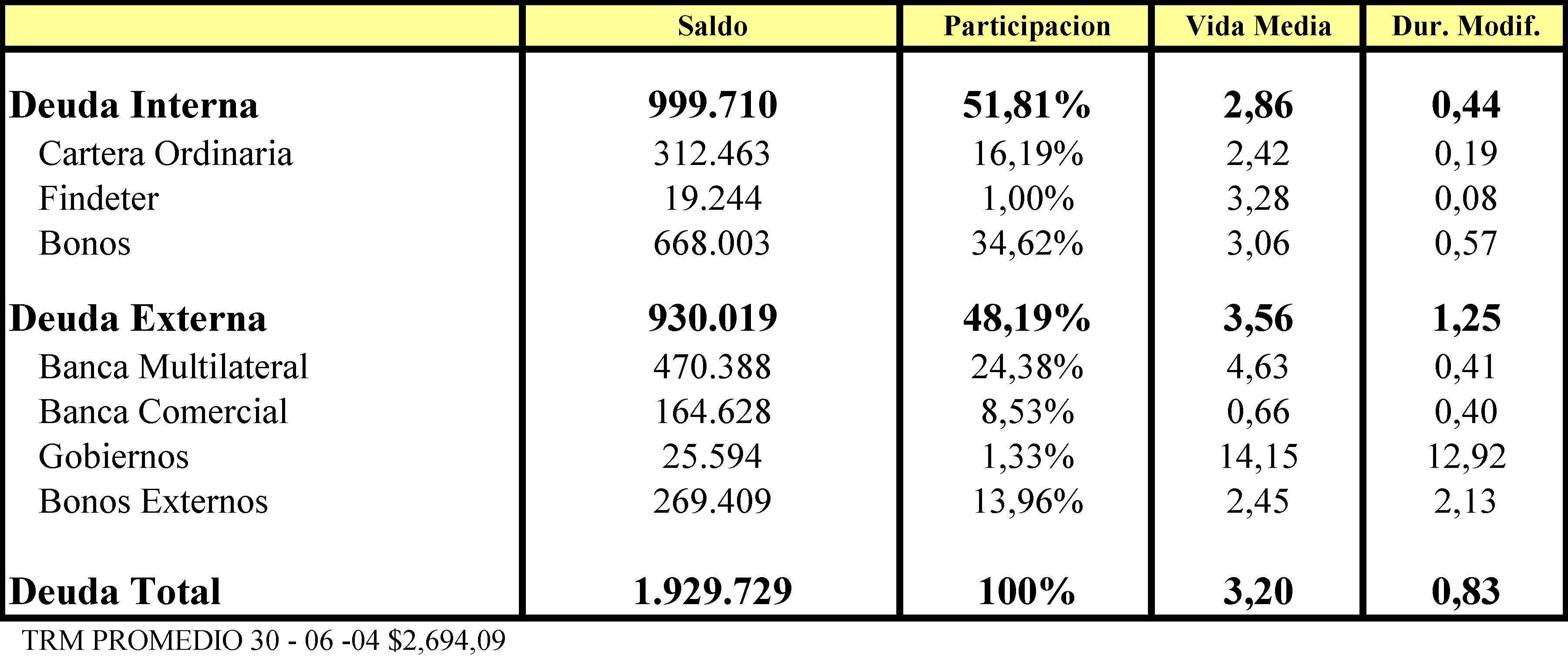 La deuda del Distrito está diversificada entre diferentes fuentes: Banca Interna, Bonos Internos, Banca Externa, Bonos Externos, Banca Multilateral y otros. Esta variedad de fuentes reduce la dependencia de una fuente en particular, contribuye a facilitar la consecución de fondos y mejora los términos de los mismos, al poder escoger entre la fuente disponible mas eficiente y generar competencia entre los prestamistas. Como muestra el Cuadro 4, el saldo de la deuda del Distrito Capital – Administración Central a 30 de junio de 2004 ascendía a la suma de $1.929.729 millones, su vida media1era de 3,20 años y la duración modificada2era de 0,83. Cuadro 4. Perfil de la Deuda de la Administración Central del Distrito Capital 30 de junio de 2004 (Millones de pesos) Fuente: SHD, Dirección Distrital de Crédito Público, Subdirección de financiamiento Al finalizar el primer semestre del año en curso la deuda externa ascendió a $930 mil millones, siendo los bonos externos el que mayor porcentaje representa, mientras que la deuda interna alcanzó la suma de $999.7 miles de millones, siendo los bonos de deuda pública los más representativos en participación, seguidos por la cartera ordinaria. Los créditos internos del Distrito se encuentran en su mayoría referenciados con una tasa DTF, adicionada a un spread; el mismo ponderado sobre el saldo de la deuda interna es de 4,25 puntos porcentuales. Como reflejo de las disponibilidades históricas de crédito para el Distrito, el portafolio presenta una alta exposición a tasas variables. En los dos últimos años la Secretaría de Hacienda ha hecho un esfuerzo manifiesto para incrementar la contratación de créditos a tasas fijas. En los pasivos externos esta meta se ha logrado mediante la emisión externa de bonos a tasa fija, mientras que en cuanto al endeudamiento interno esta política se ha reflejado con las colocaciones del segundo y tercer tramo del Programa de Emisión y Colocación de Bogotá con bonos a tasa fija a dos y tres años respectivamente. Las participaciones al 30 de junio de 2004 eran de 74.19% para la deuda a tasa variable y de 25.81% para la deuda a tasa fija. Gráfico 1. Composición de la Deuda a Junio de 2004